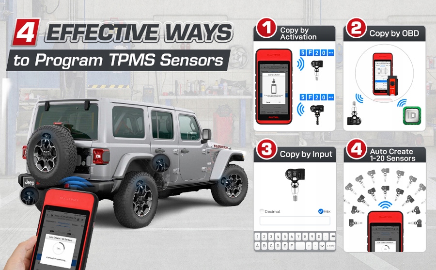 4 способи програмування датчиків MX 315/433 МГц: копіювання за допомогою активації, копіювання за OBD, копіювання за допомогою введення та автоматичне створення 1-16 Датчики