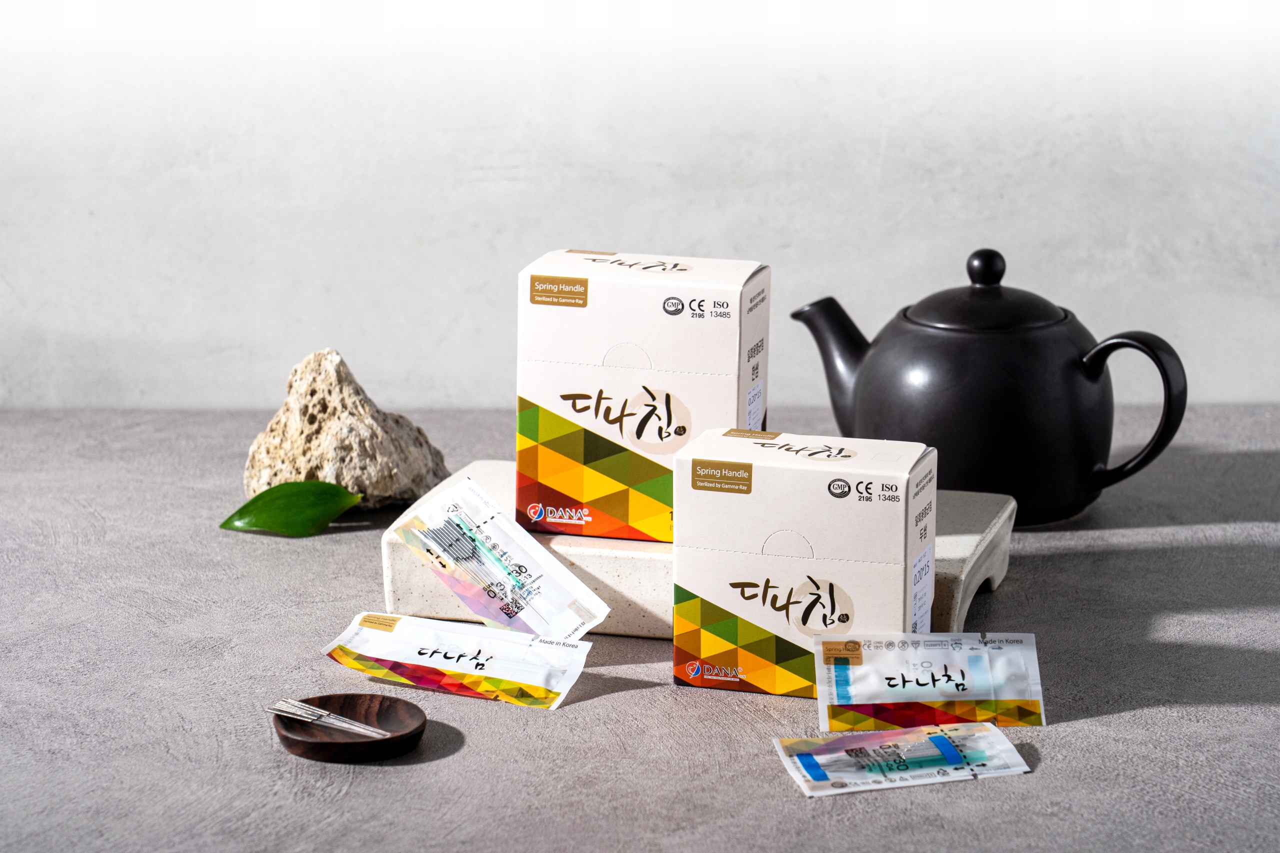 Оригінальні корейські акупунктурні голки зі сталевою ручкою та НАПРАВЛЯЮЧИМ від Dana. Голки одноразові, стерильні, упаковані в блістер по 10 голок + 1 направляюча. Голки мають сертифікати, включаючи CE, і допущені до торгівлі по всій Європі. Голка виготовлена зі сталі найвищої якості, ручка має сталеву оплітку.