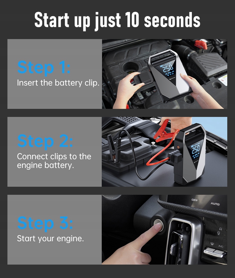 Все в одному: замінює три окремі пристрої (стартер, компресор, блок живлення), економлячи місце в багажнику.