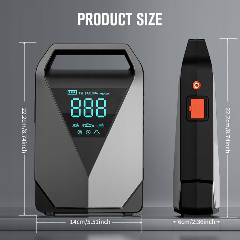 Вбудований компресор: інтегрований насос для шин із тиском до 150 PSI і точний манометр дозволяють швидко й точно накачати шини без потреби в окремому пристрої.