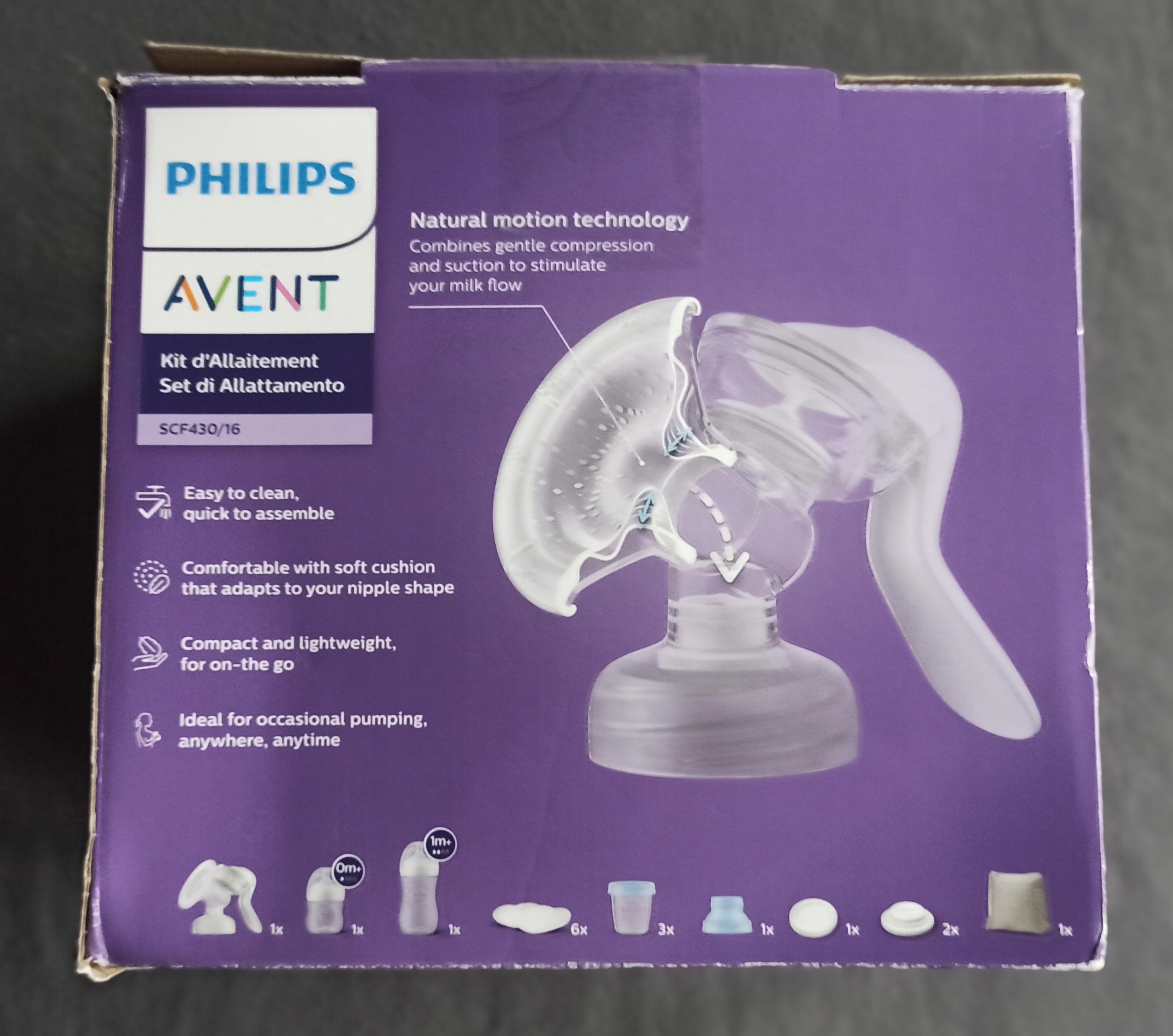 - Included: 1 AVENT hand breast pump kit, 1 food distracting set with a handle, 1 bottle with a capacity of 266 мл з соском для дітей з 1 місяця вище, 6 одноразових вставок лактації