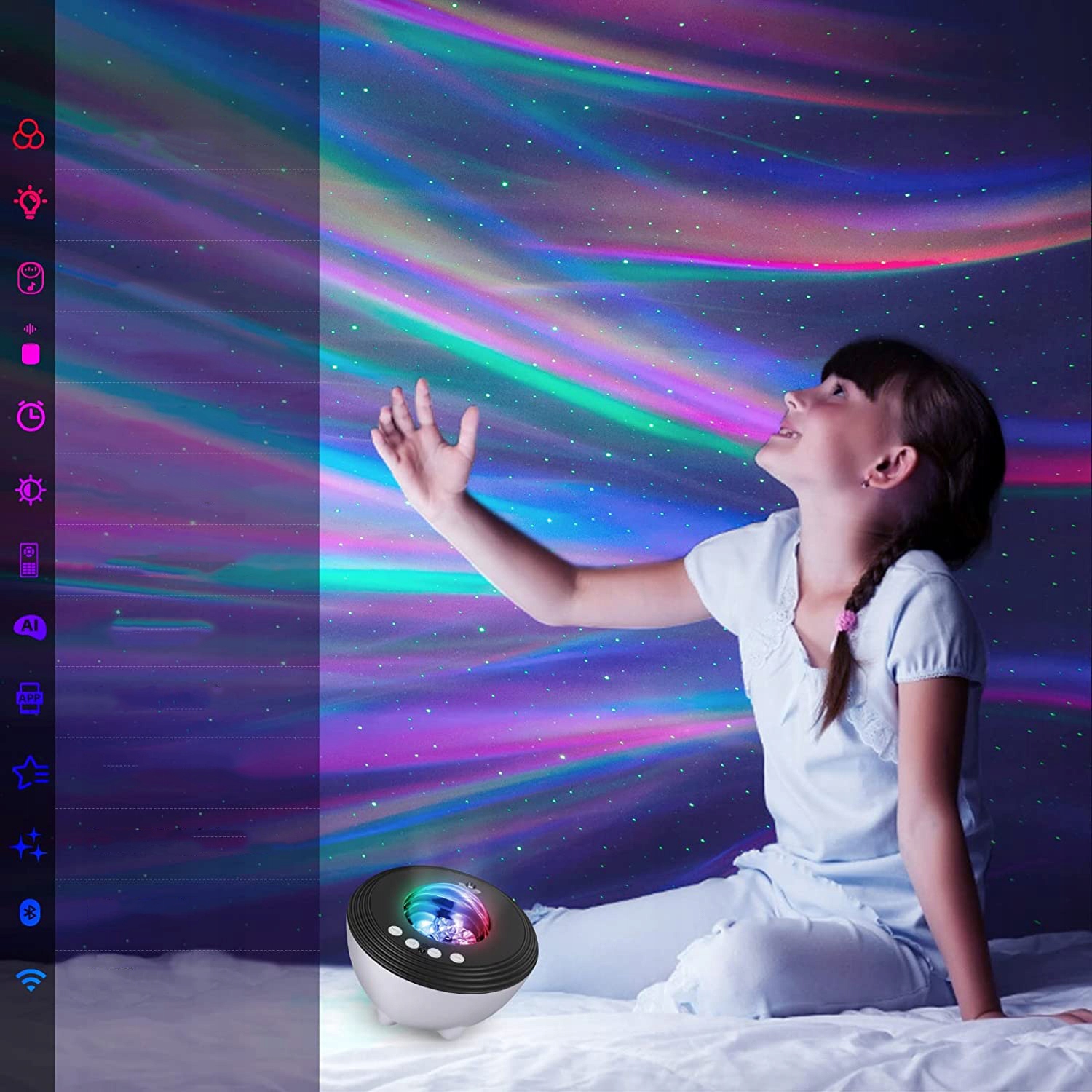 👍👍👍【Зоряний проектор】 Проектор може проектувати кольорове зоряне небо на вікна та стеля будь-яких приміщень. Змішуйте кольори з різною насиченістю, яскравістю RGBW і швидкістю потоку, щоб представити різні світлові ефекти, світле/темне світло галактик, забезпечуючи чудові ефекти проекції, що ідеально підходить для сімейних зустрічей, вечірок, днів народження дітей, Різдва тощо.