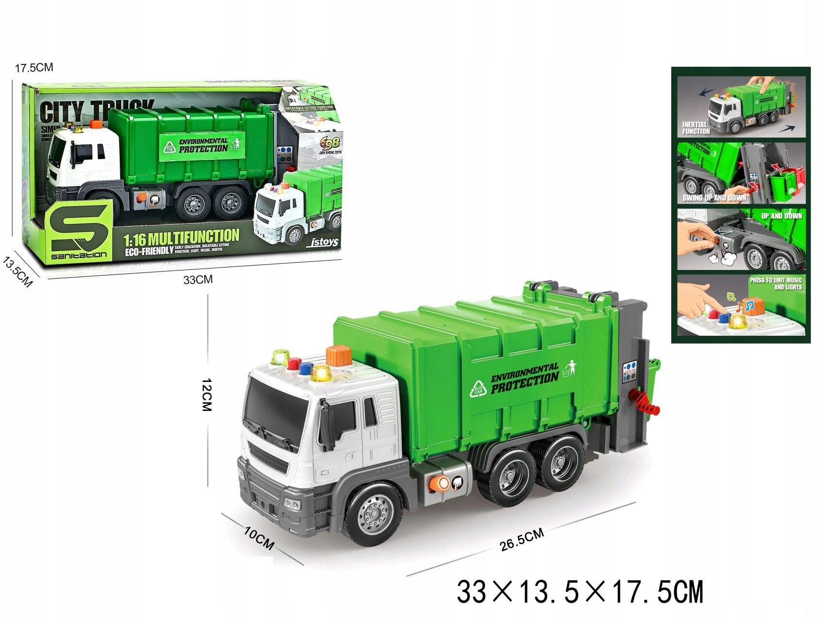 Реалістична сміттєва вантажівка - ідеальна іграшка для маленьких любителів муніципальних транспортних засобів. Завдяки легким та звуковим ефектам, задоволення стає ще привабливішим та реалістичним. 4 CM