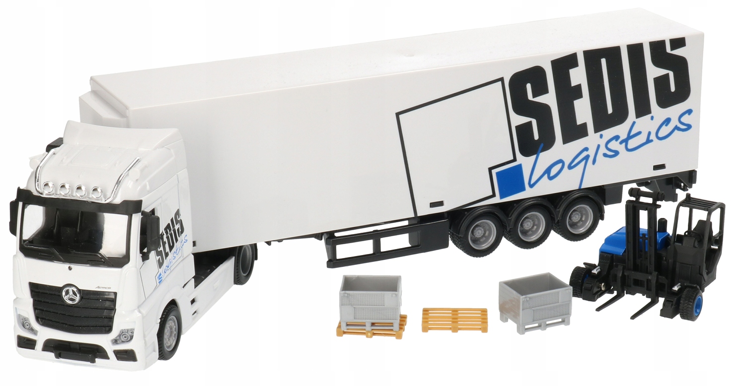 Оригінальна модель Bburago, що складається з автомобіля Mercedes Actros, автомобіля в масштабі 1:43 і напівпричепа.