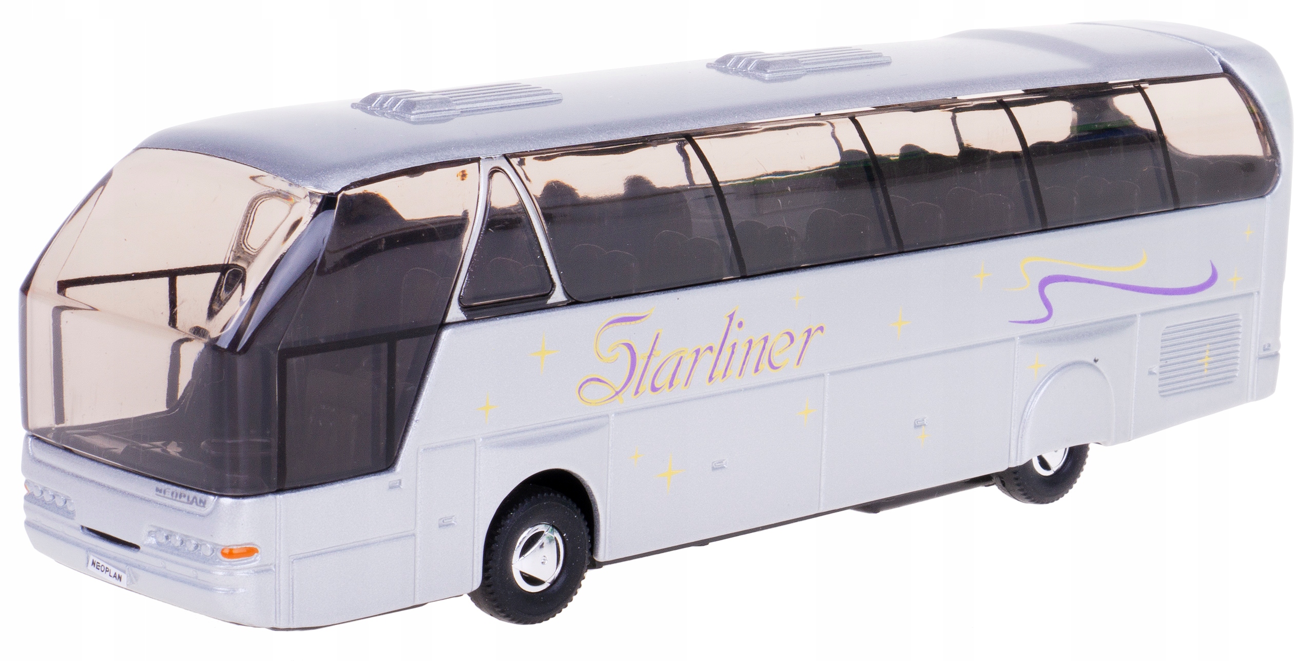 Туристичний автобус NEOPLAN STRLINER масштабу 1:64 від WELLY виготовлений дуже акуратно з металу та пластику з відкатним приводом на гумових шинах з дверима, що відкриваються на зі сторони пасажира.