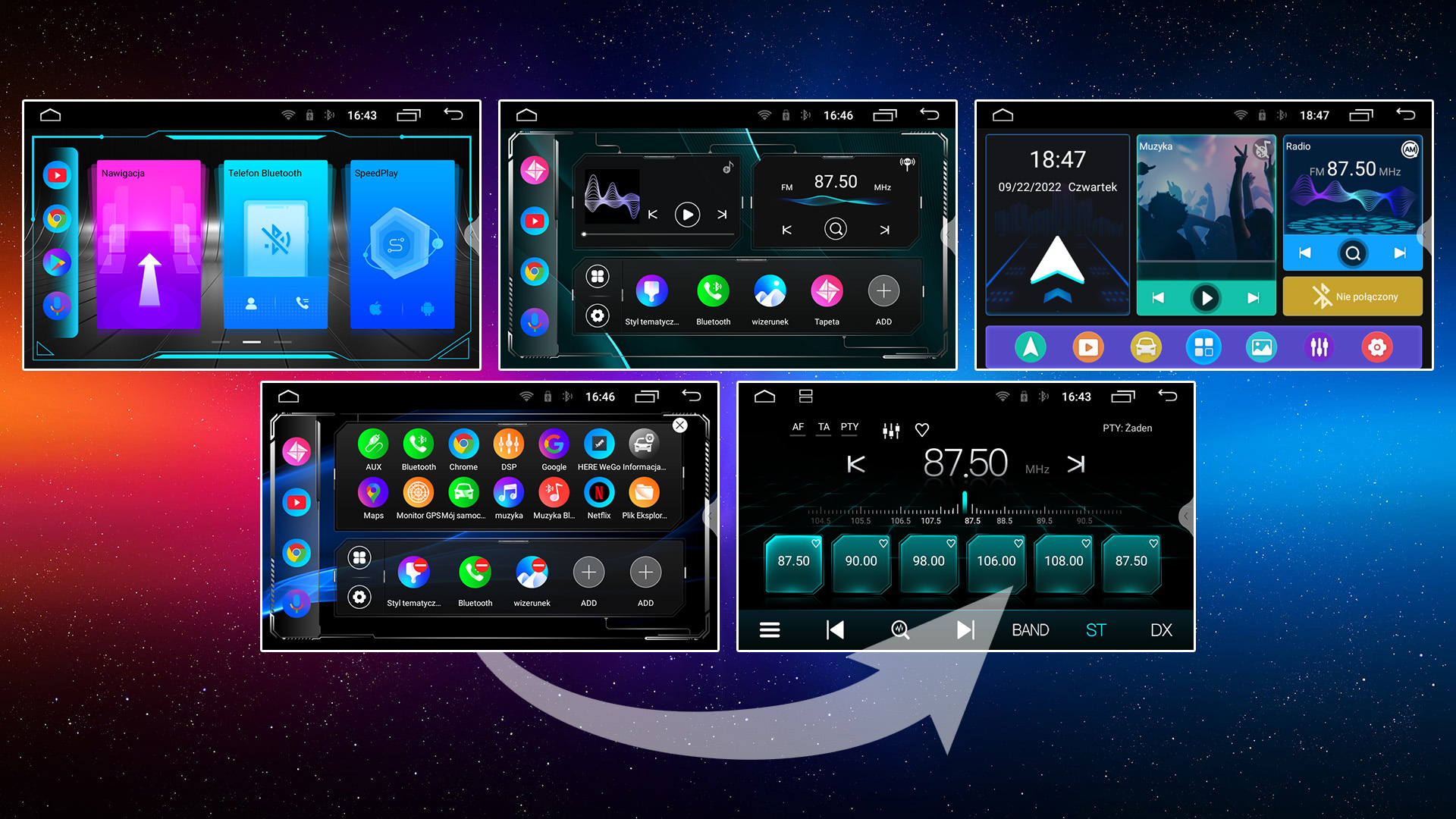 Остання версія Android надає аж 18 варіантів вигляду меню, які ви можете налаштувати. Можливість змінити дизайн у будь-який час залежно від вашого настрою! Відповідайте зовнішньому вигляду інтерфейсу салону вашого автомобіля.