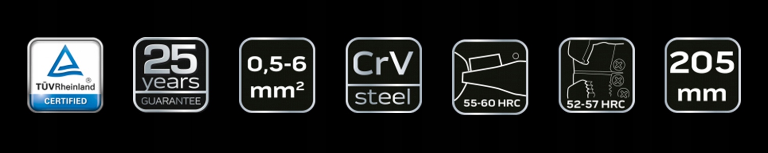 Автоматичний знімач ізоляції 205 мм, передня частина, твердість губок 52-57 HRC, робочий діапазон 0,2-6,0 мм2, діапазон обтиску клем роз’єму 22-10AWG (1,5-6 мм2), TÜV сертифікат