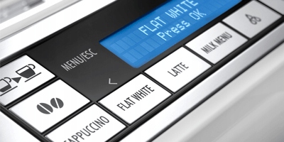 - Меню повної молочної кави зі спеціальними кнопками капучіно, кафелатте та латте макіато та можливістю готувати гаряче молоко,
