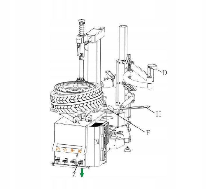 Щоб демонтувати нижню ніжку, скористайтеся поворотною платформою. Покладіть диск під шину так, щоб він не торкався обода. Натисніть педаль Z, робочий стіл почне обертатися, і в той же час, використовуючи джойстик керування, поступово піднімайте поворотний стіл так, щоб він підняв шину та одночасно зісковзнув борт шини з краю його сидіння на ободі. Коли нижній борт шини повністю від’єднано від обода, перейдіть до стандартної процедури розбирання за допомогою монтажної головки та ковша.
