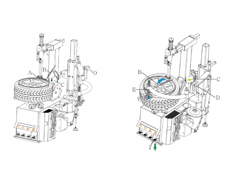 Підніміть опорний ролик C і перемістіть його у вихідне положення, щоб він більше не знаходився в робочому просторі. Розмістіть кінець натискного важеля E над бічним краєм шини, навпроти монтажної головки A. Використовуючи джойстик D, опустіть натискний важіль так, щоб борт шини знаходився нижче краю, де шина сидить на ободі. За допомогою ковша B натягніть борт шини на монтажну головку. Правильно сидяча нога з лівого боку голови повинна бути під полозом, а з правого боку на голові голови.