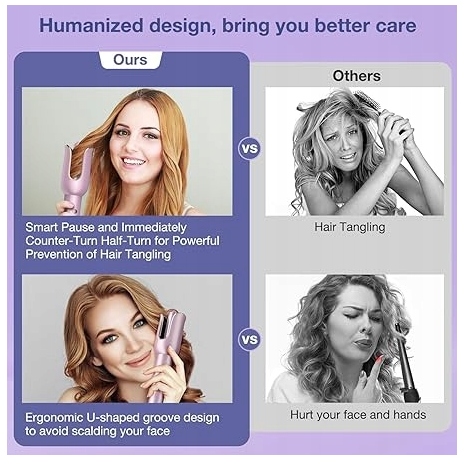 - Економія часу та зусиль: наша автоматична плойка призначена для простого використання та не потребує спеціальних навичок. Просто помістіть волосся в U-подібний паз, натисніть кнопку, і ви зможете швидко й без зусиль створювати красиві та довготривалі зачіски, економлячи час.