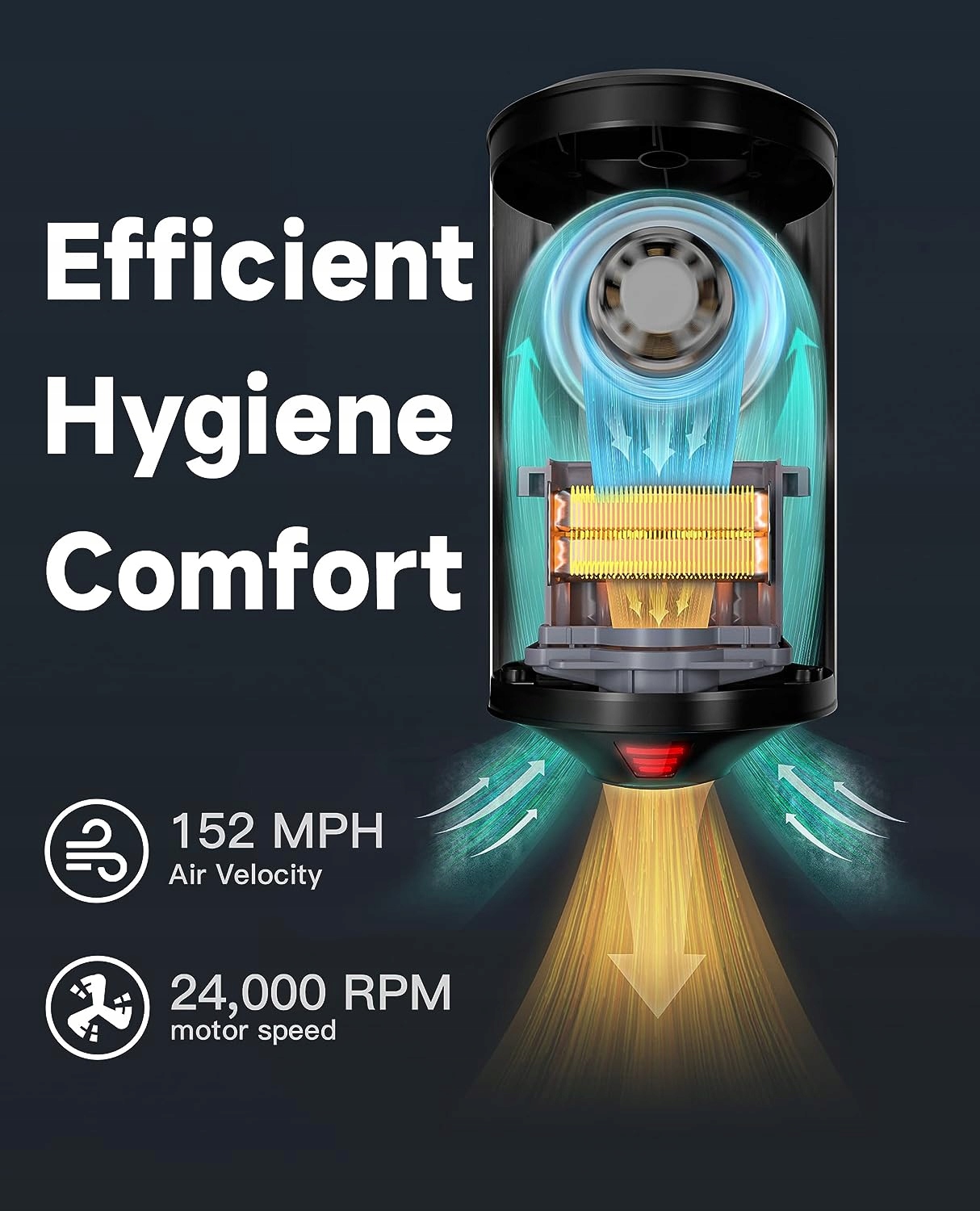 - Інтелектуальна система опалення – якщо температура навколишнього середовища нижче 25°C, опалення вмикається, в іншому випадку – вимикається. Температура повітря: 20℃-40℃. Не пошкоджує дитячі руки. Порівняно з традиційними сушарками для рук, споживання енергії можна зменшити до 80%. Ексклюзивна функція нашої сушарки для рук.