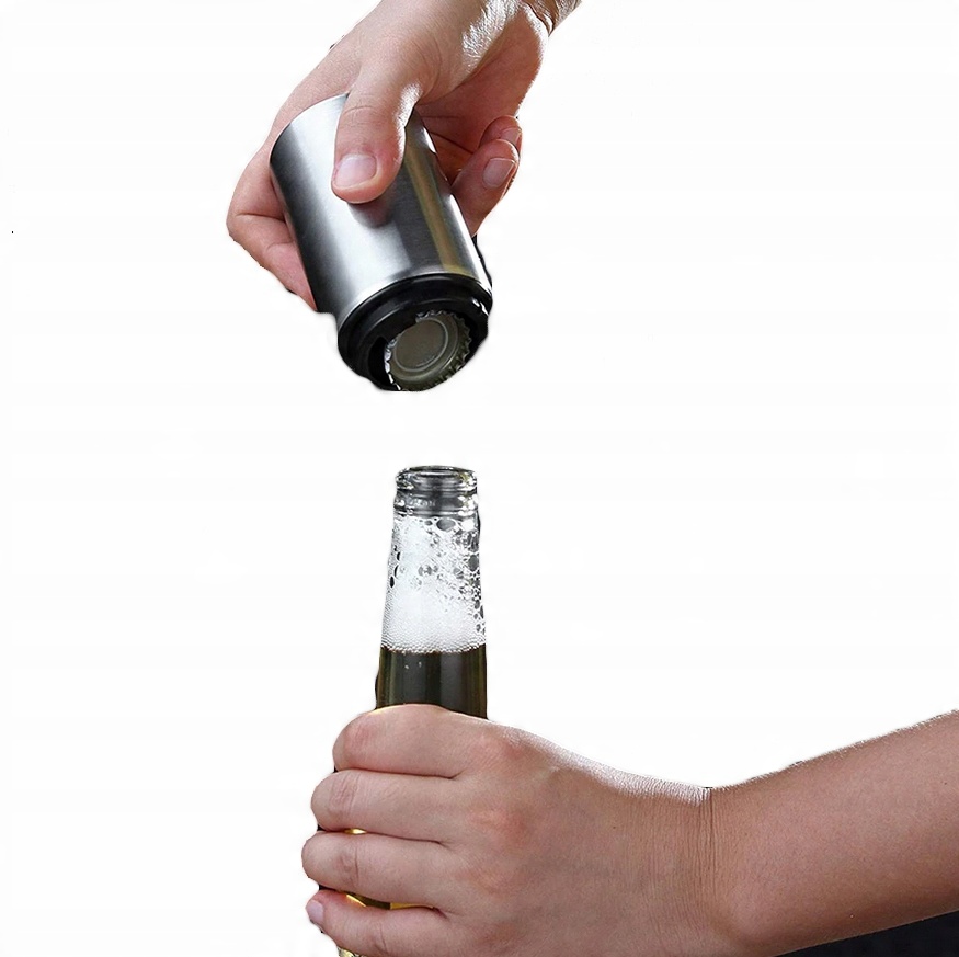 Простий у використанні відкривач для пляшок. Він виготовлений із міцної нержавіючої сталі; одним сильним натисканням знімається кришка. Магнітна функція утримує кришку на місці.