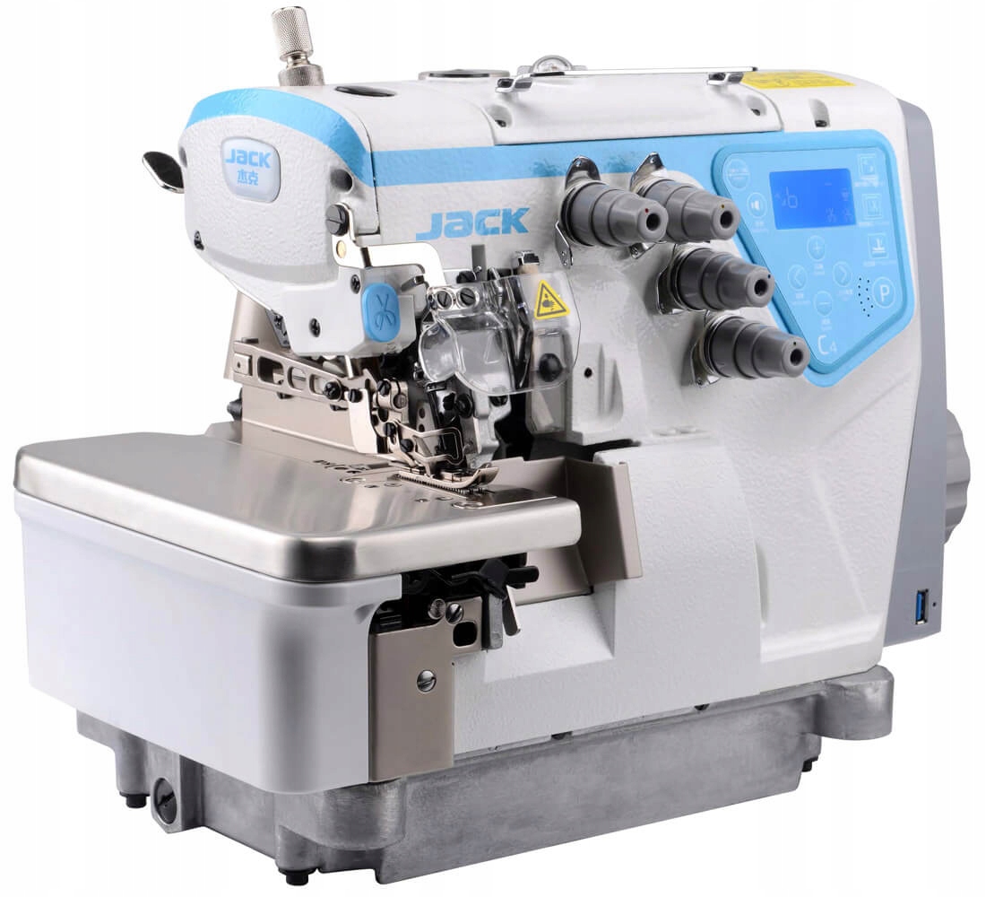 Високоефективний 5-нитковий, 2-голковий оверлок з кроком 3 мм, оснащений інтегрованим енергозберігаючим двигуном монтується в головці безпосередньо на валу головної машини (система Direct Drive), що гарантує тиху та надійну роботу та менше споживання електроенергії. Сучасний дизайн машини забезпечує кращу вентиляцію двигуна, а отже, більш швидку та ефективну роботу, і, як наслідок, більший термін служби машини. Оверлок JACK C4 має просту панель для регулювання швидкості шиття та позиціонування голки, а також можливість повернення до заводських налаштувань. Вбудоване світлодіодне освітлення робочої зони з можливістю 3-ступінчастого регулювання. Оверлок з автоматичними функціями: підняття лапки, обрізання ланцюжка до і після шиття. Верстат оснащений голосовим помічником польською мовою.Це перший промисловий оверлок у світі з такою функцією.