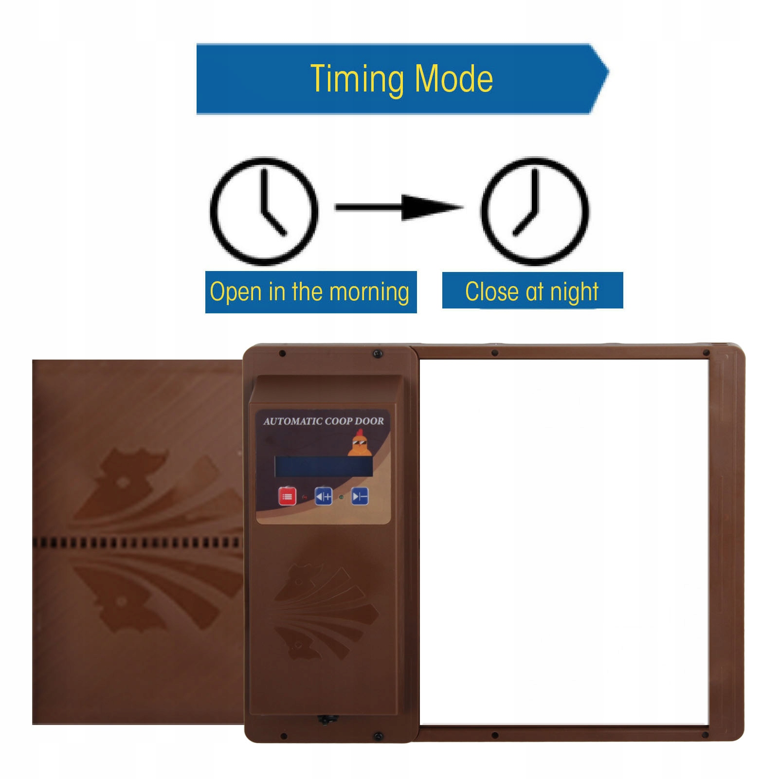 2. Режим таймера: Режим часу дозволяє встановити час відкриття та закриття дверей курятника залежно від сезону, напрямку та звичайного часу входу та виходу курей, які містяться в неволі.