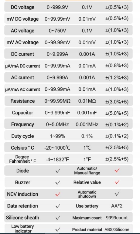Вимірювання ємності 99,99nf/ 999,9nf/9,999f/99,99f/999,9f ±(2,0%+5)