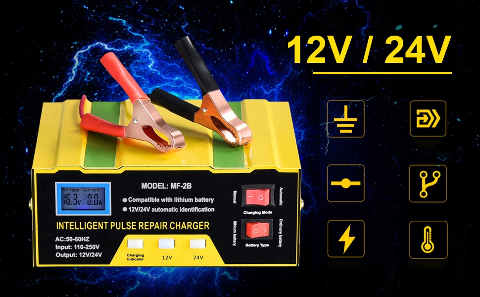 🔋🔋inteligenta зарядний пристрій використовує технологію ремонту імпульсу, яка забезпечує ефективне ремонт та активацію акумулятора низької напруги, яка тривалий час є неактивною або неможливо заряджати.