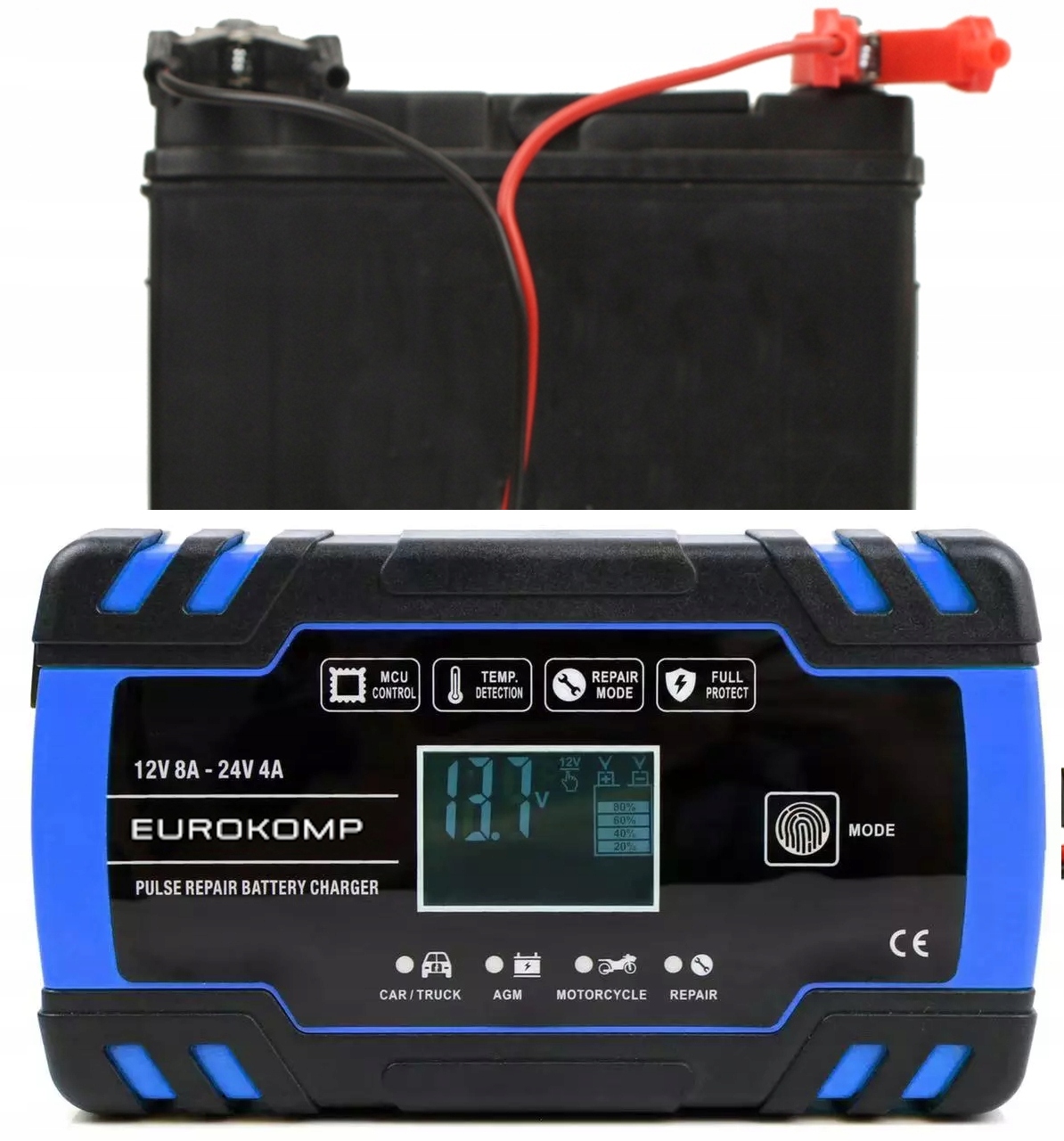 Зверніть увагу, що представлена батарея генерує струм до 8 А, що гарантує швидку зарядку кожної батареї 12 В і 24 В. Ви не знайдете такої потужності на інших аукціонах конкурентних випрямлячів.