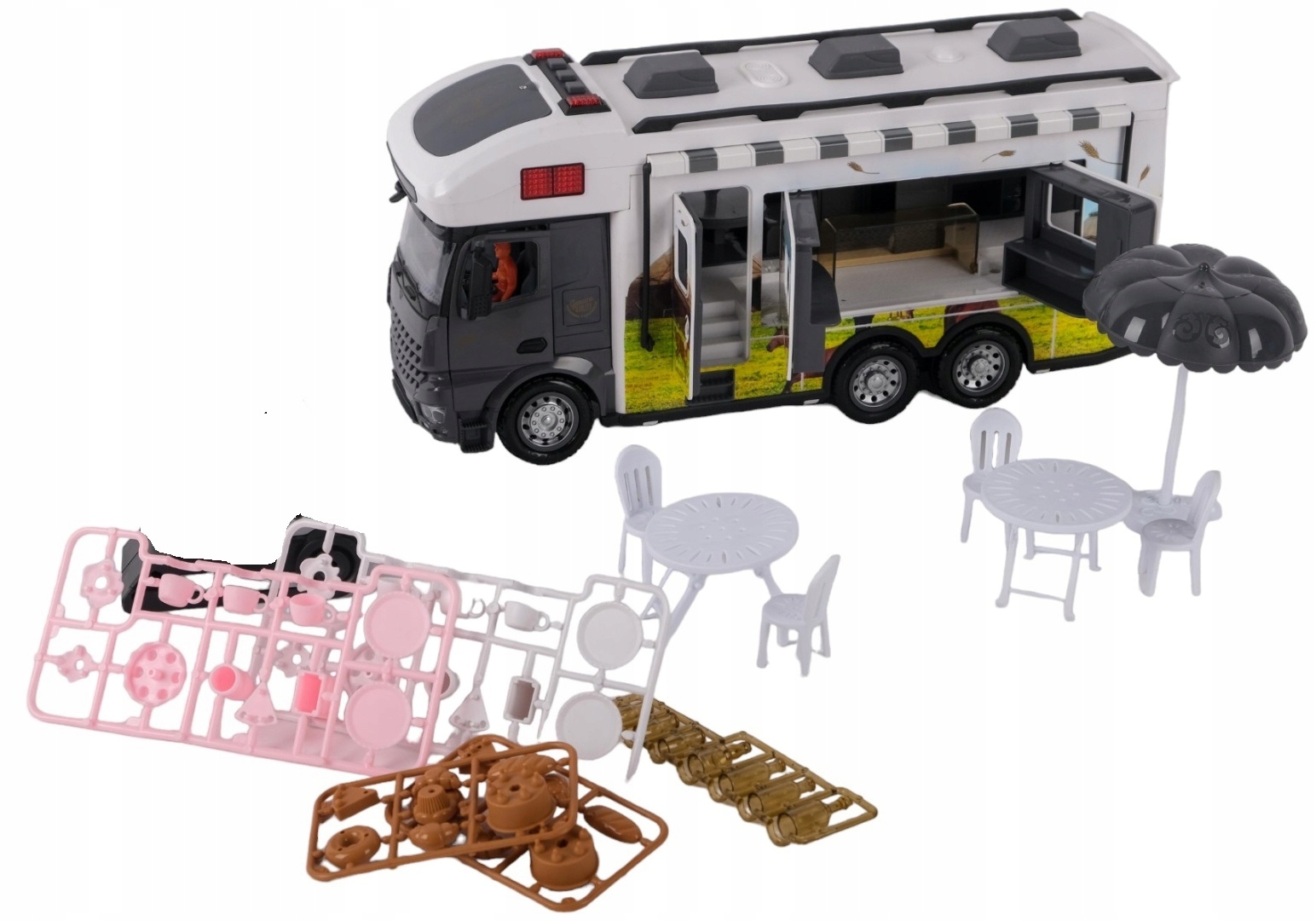 Кемпер + комплект аксесуарів. Вирушайте у відпустку у просторому туристичному фургоні. Знайшовши місце для кемпінгу, підготуйте автомобіль, з лівого боку автомобіля є двері, що відкриваються, і висувна москітна сітка, а з правого боку є знімні внутрішні ящики, куди ви можете розмістити свої аксесуари та почати кемпінг! Хто буде накривати стіл? Все відкривається і рученята без проблем впораються. Чудово виготовлений кемпер. Автомобіль з багатьма аксесуарами. У відпустці чи вдома – здійсніть мрію вашої дитини про власний кемпер.