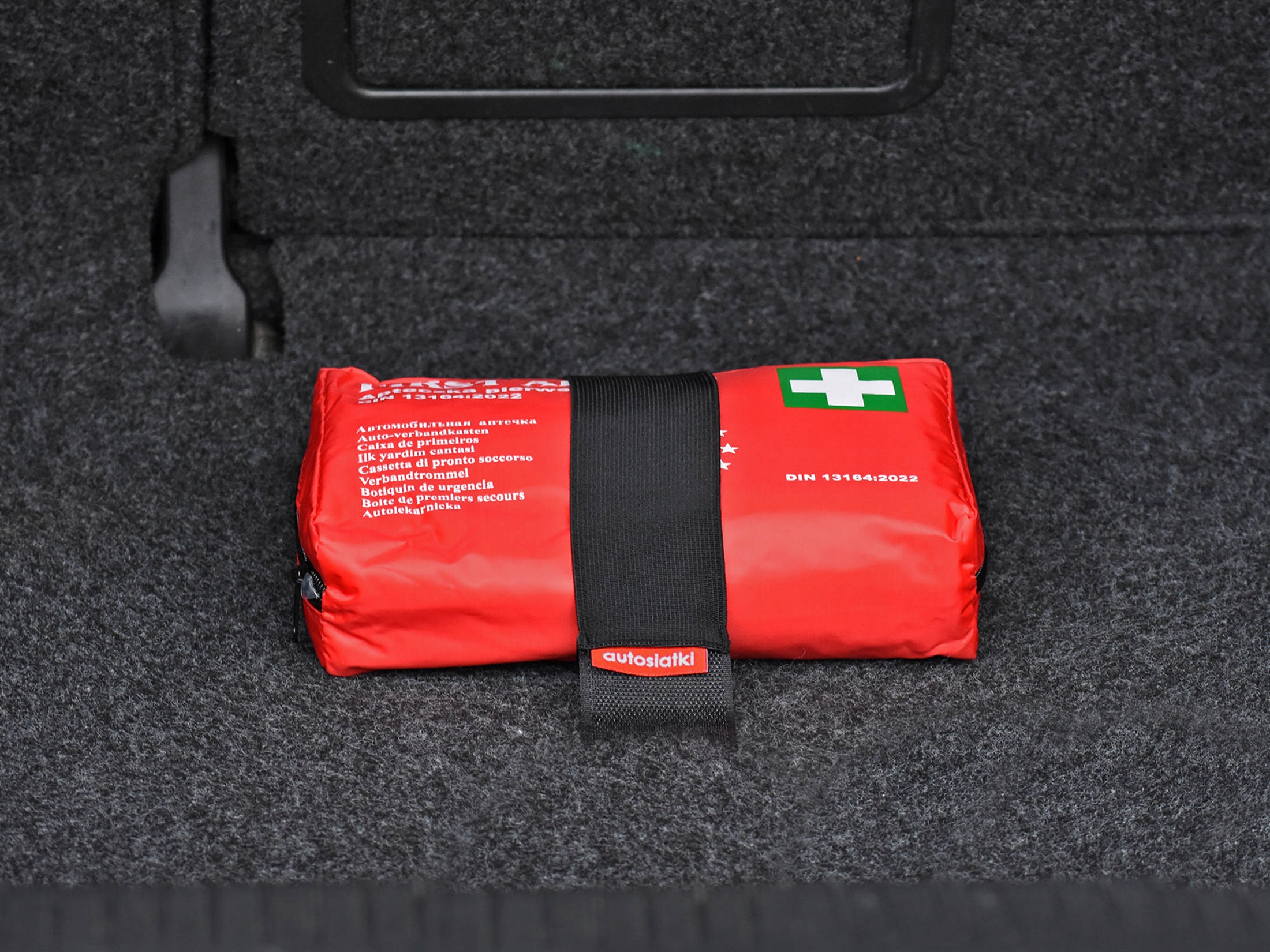 Автомобільна аптечка, обладнана відповідно до DIN 13164. Виготовлений з водонепроникного поліестеру закривається на блискавку. Аптечка має компактні розміри та необхідне обладнання для надання першої допомоги постраждалим у дорожньо-транспортних пригодах. Кріпиться на оббивку автомобіля за допомогою практичної ручки з липучки. Перед покупкою переконайтеся, що липучка прилипає до оббивки вашого багажника. Якщо липучка, наприклад, куртки чи сумки, прилипне до килима, ручка поводитиметься так само.