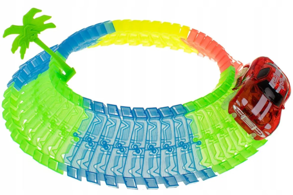 ⭐ Різноманітність іграшки - гнучка доріжка, місток, спуски, повороти, петлі - це різноманіття додає грі веселості та надовго не набридне. Набір дозволяє створити багато версій треку. Наприклад, ви можете з’єднати 30 елементів треку в петлю, і машина, що рухається в ній, буде бігати по підлозі разом із трасою, або розташуйте елементи під кутом, щоб створити коло.