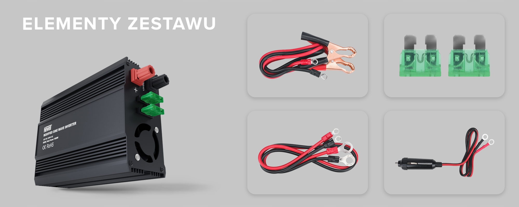 Бренд Newell вирішив задовольнити різноманітні потреби користувачів інверторів. Крім традиційних кабелів, що дозволяють з'єднати перетворювач напруги Newell з акумулятором, і кабелю, сумісного з гніздом автомобільного прикурювача, в набір входить ще щось. Кабелі з затискачами (зазвичай їх називають затискачами) забезпечують ще більшу свободу підключення інвертора до електричних пристроїв!