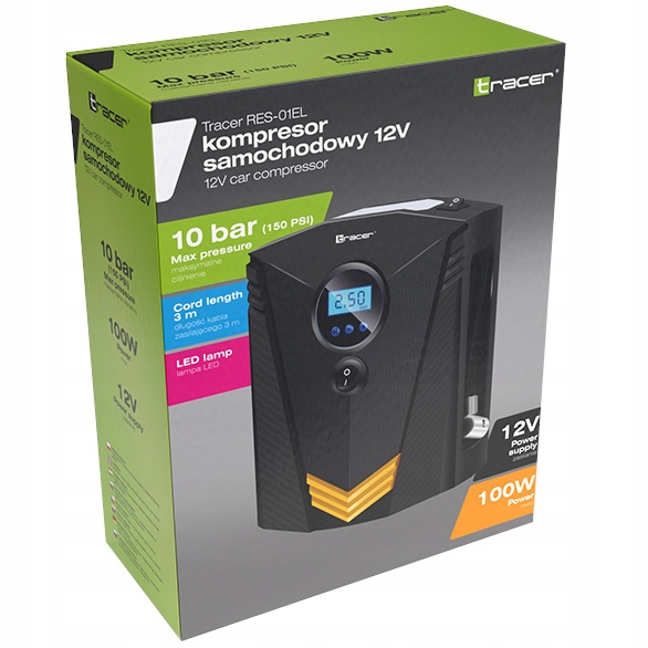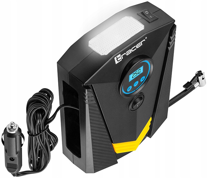 Завжди почувайтесь у безпеці, коли їдете кудись у своєму автомобілі. Автомобільний компресор TRACER завжди допоможе швидко та якісно накачати шини. Висока швидкість повітряного потоку, легке регулювання тиску і живлення від стандартного гнізда прикурювача, а також 3 змінних наконечника, що входять в комплект, роблять цей пристрій незамінним елементом обладнання вашого автомобіля. Інтегрований світлодіодний ліхтар з успіхом замінить ліхтарик і підсвічуватиме колеса під час накачування.