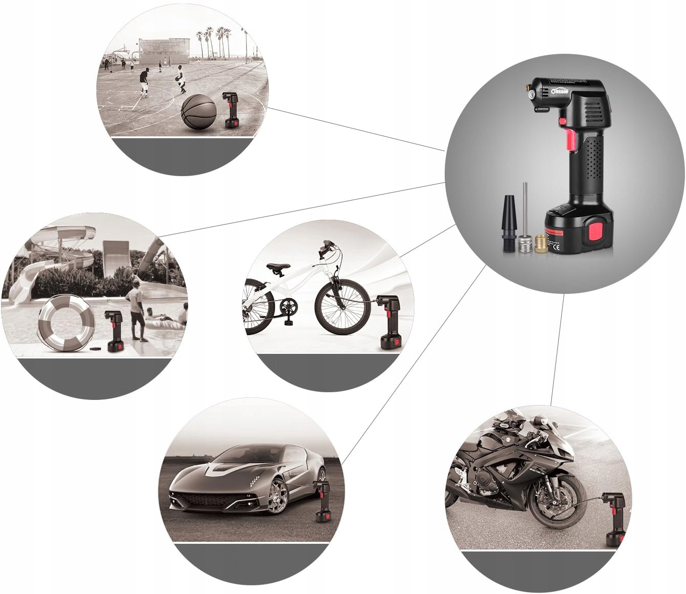 Oasser пропонує в комплекті з насосом для накачування шин: 1 акумулятор, автомобільний зарядний пристрій 12 В, домашній зарядний пристрій 110 В, 1 клапан Presta, 1 кулькову голку, 1 насадку для іграшок. У набір також входять 2* повітряні шланги (35 см і 12 см), робочі рукавички та сумка для зберігання.