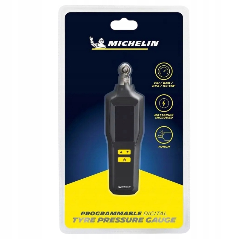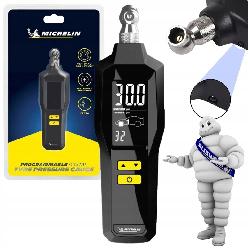 Точне вимірювання тиску завжди під рукою! Цифровий манометр MICHELIN — це сучасний і компактний інструмент, який дозволяє програмувати значення для різних транспортних засобів і контролювати тиск із точністю до 1 PSI.