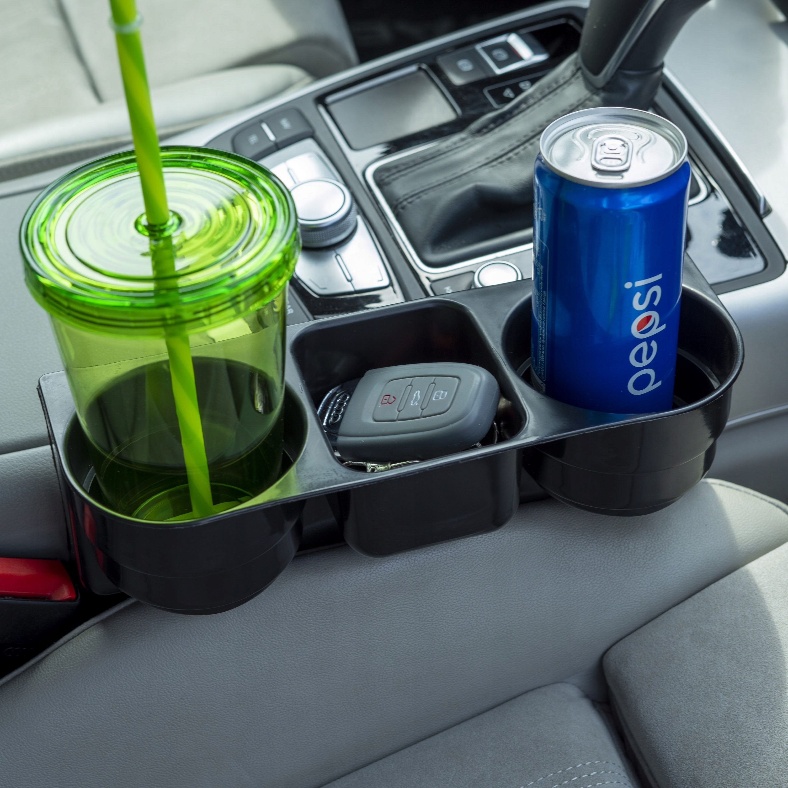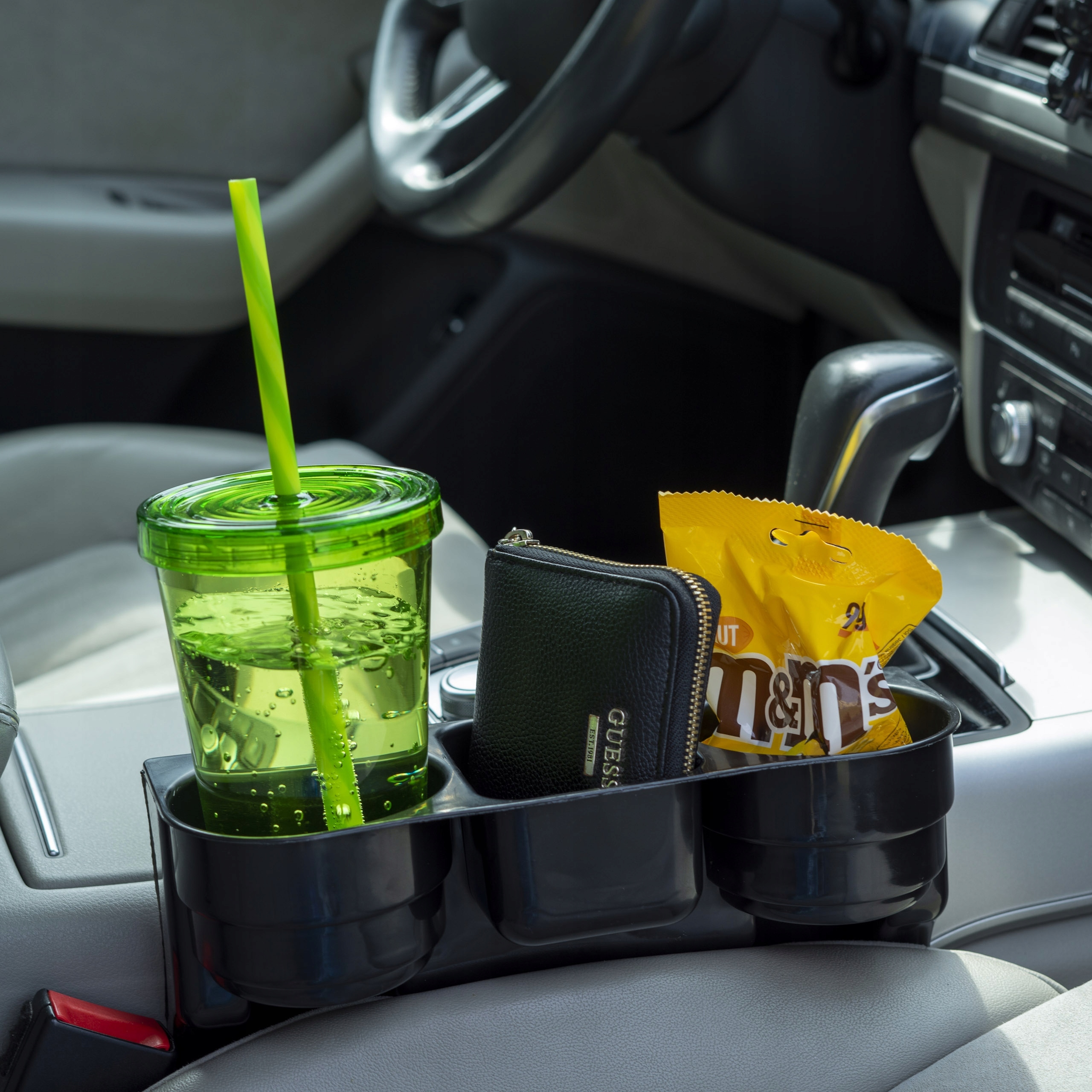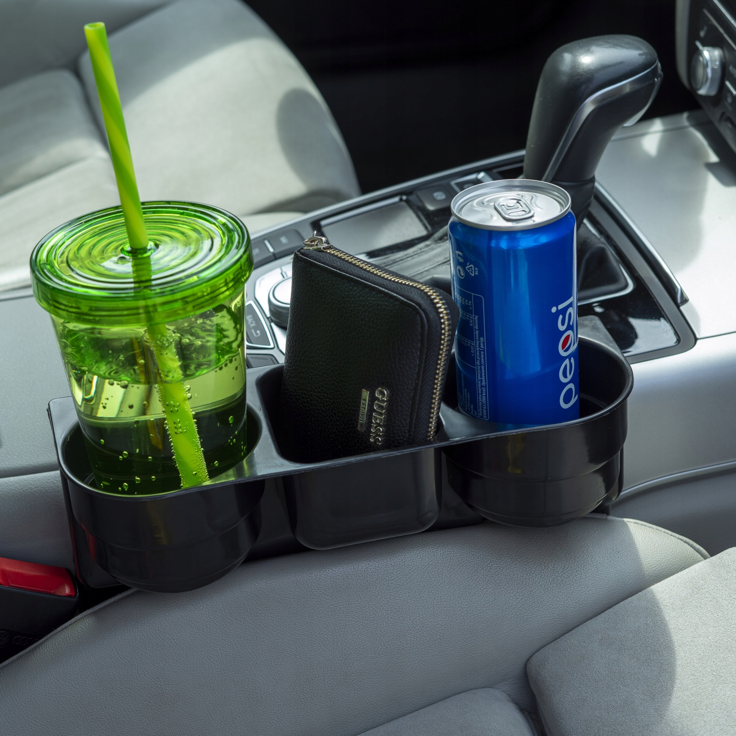 Тримач має великі отвори, тож ви можете помістити в нього пляшки, шейкери, ВЕЛИКІ кави (подібні тримачі часто вміщують лише маленькі кави чи банки). Тримач також має квадратне відділення, в яке можна помістити, наприклад, ключі, ключі, гаманець або телефон.