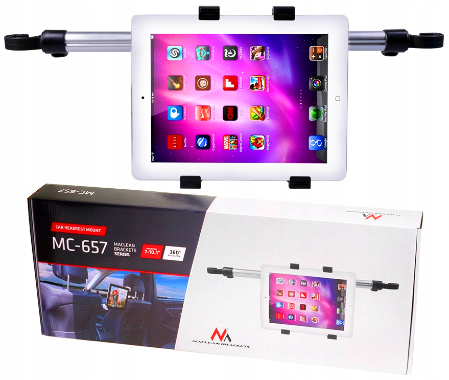 Універсальний автомобільний тримач для планшета встановлюється між сидіннями для кронштейнів підголівників водія та пасажира. Наша ручка ідеально підходить для довгих подорожей з дітьми, розважаючи їх під час водіння. Регульована довжина рукоятки дозволяє встановити ручку практично в будь-який автомобіль.