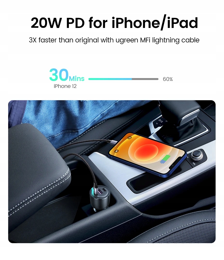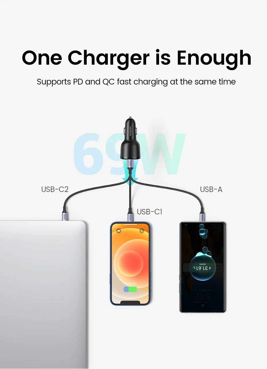Автомобільний зарядний пристрій Ugreen 2x USB-C 1x USB-A 69W