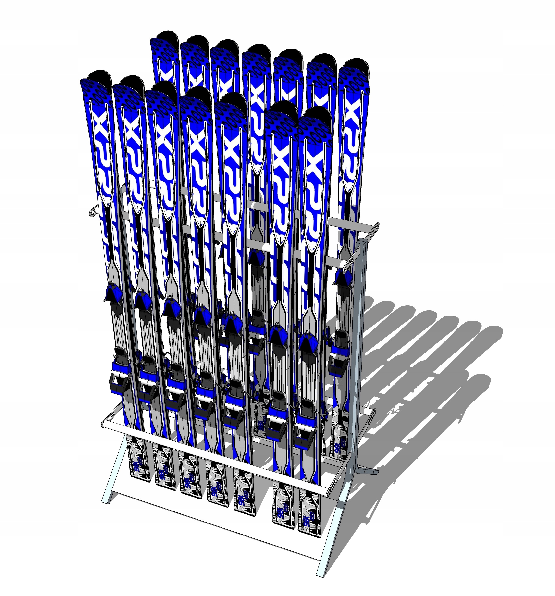 Стійка для лиж на 14 пар лиж або сноубордів – Окрема стійка для зберігання приблизно 14 пар лиж у вертикальному положенні з системою самоблокування, стійка також може вмістити сноуборди, але значно зменшує це місце для лиж для повноцінно організованої групи, пропонуємо окремо стоячу стійку для сноубордів на 10-20 пар. Завдяки використанню протиковзких натягів лижі не можуть випасти з тримача після застрягання Конструкція підставки може бути повністю розібрана, що дозволяє заощадити місце після зимового сезону. При використанні підставки як частини лижного спорядження, лижі поміщаються в тримач і встигають розморозити сніг, що залишився, а завдяки нижньому утримувальному ласту вода транспортується на підлогу, де її можна легко очистити, зберігаючи це чисто і охайно. Стенд має антикорозійний захист гальванічним цинкуванням. Представлений стенд можна з’єднати разом, щоб створити один ряд стендів, подвоївши кількість місць