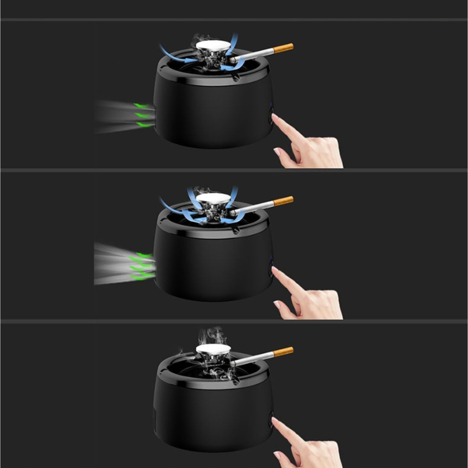 - Оснащений фільтром з активованого вугілля для поглинання запаху сигарного диму та неприємних запахів. Вбудований вентилятор всмоктує і вдихає пари. Попільничка – 2 варіанти швидкості для задоволення різних потреб у невеликих приміщеннях.