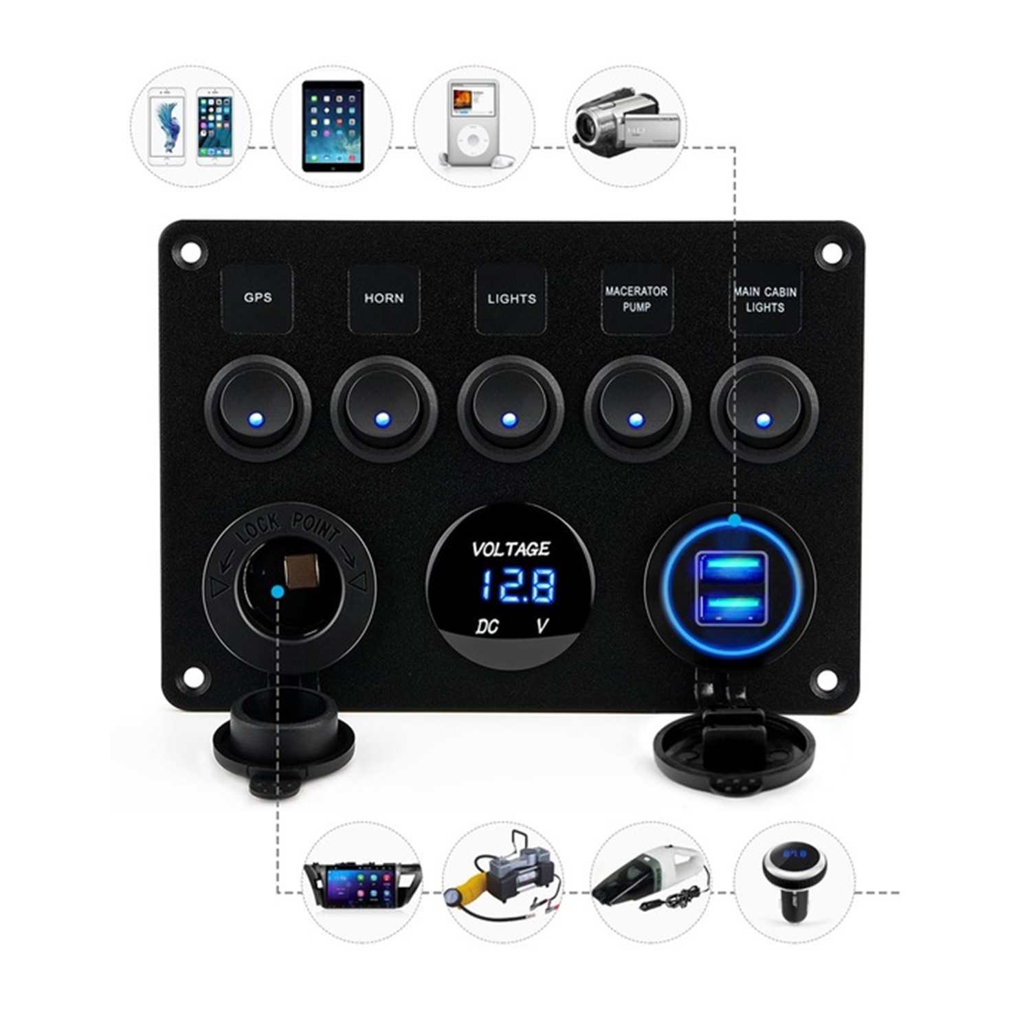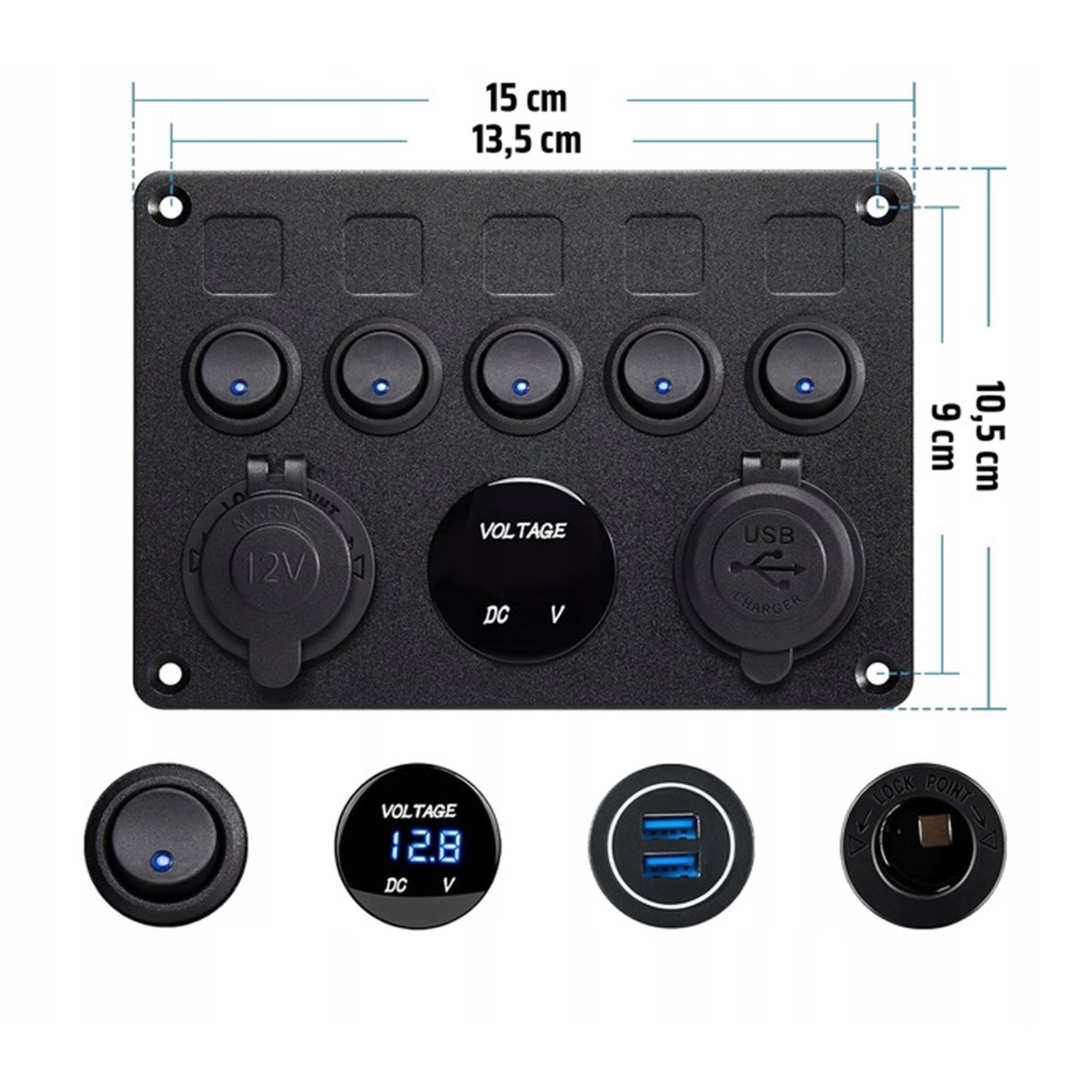 ✅Багатофункціональність: панель поєднує в собі 5 перемикачів, подвійний зарядний пристрій USB, вольтметр і гніздо прикурювача, що дозволяє централізовано керувати різними пристроями.