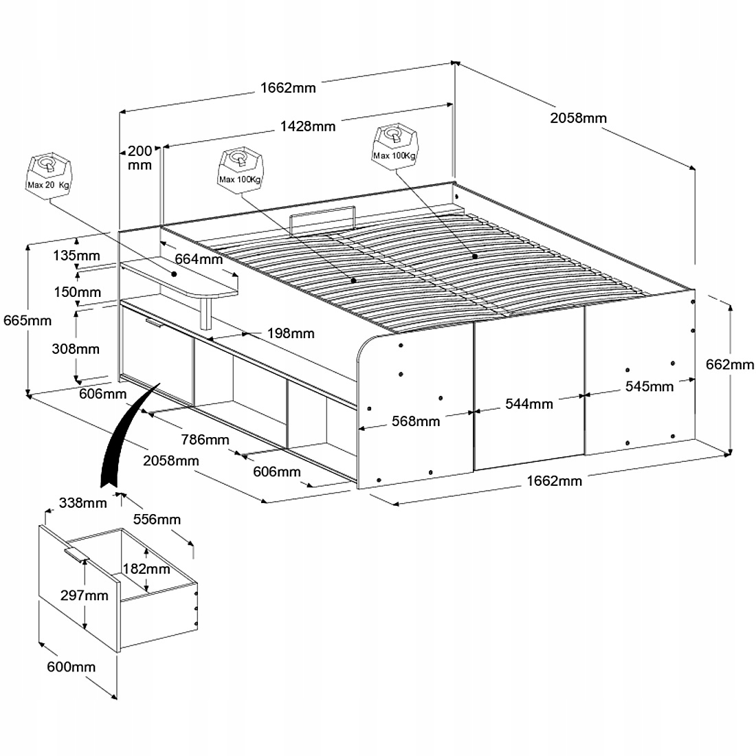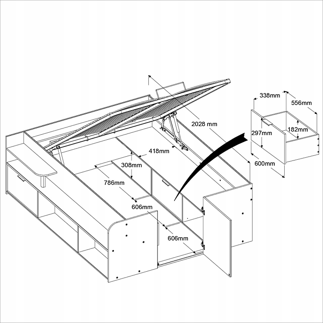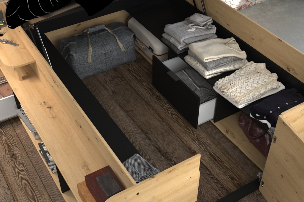 Подорож - це багатофункціональне ліжко, виготовлене в модному поєднанні дубових та чорних кольорів. Багатофункціональне ліжко оснащене піднятою рамою, під якою є справжній гардероб з низкою полиць та ящиків, що полегшують зберігання. Це ідеальне рішення для пари, яка проживає в маленькій квартирі чи молодь, яка шукає оригінальне та функціональне ліжко. Багатофункціональне ліжко подорожі - це абсолютний удар на ринку меблів!