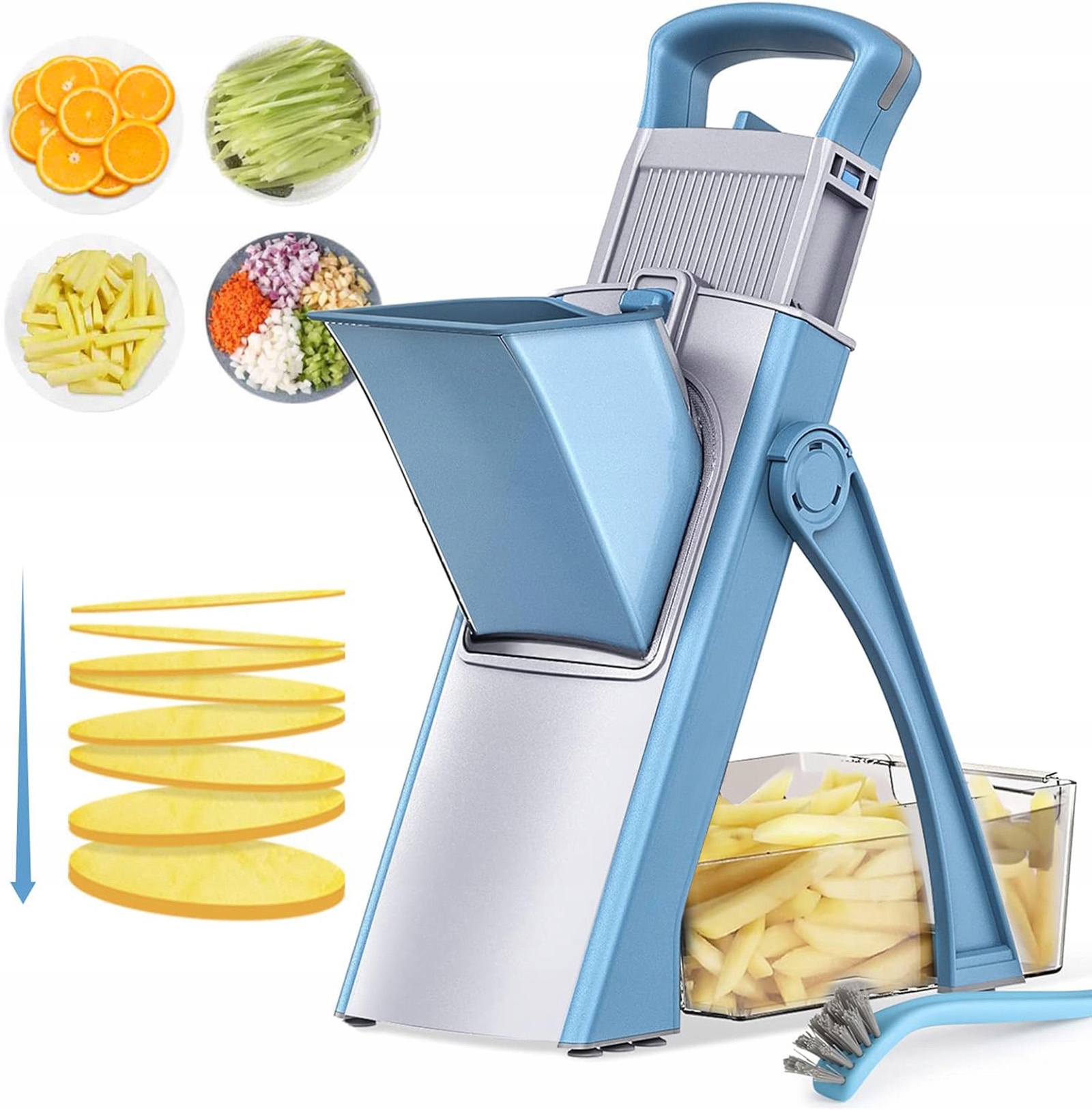 Удосконалена ручка автоматично відображається після натискання, щоб заощадити зусилля, більший отвір для партії та подрібнювач контейнера може скоротити більше їжі, а побудована анти -корозійна леза з нержавіючої сталі 420 дозволяє отримати більшу швидкість різання, швидку підготовку рослинних салатів, фрисні смаки та ін. Овочева оболонка виготовлена з екологічного абс із вбудованими лезами з нержавіючої сталі, стійкими до іржі, без необхідності заміни лопатей, збільшивши силіконову основу анти -ссання. konstrukcję, która jest łatwa do czysczenia, możesz użyc małej szczotki, którą dostarczamy, aby łatwo usunąc resztki jedzenia pod kranem.