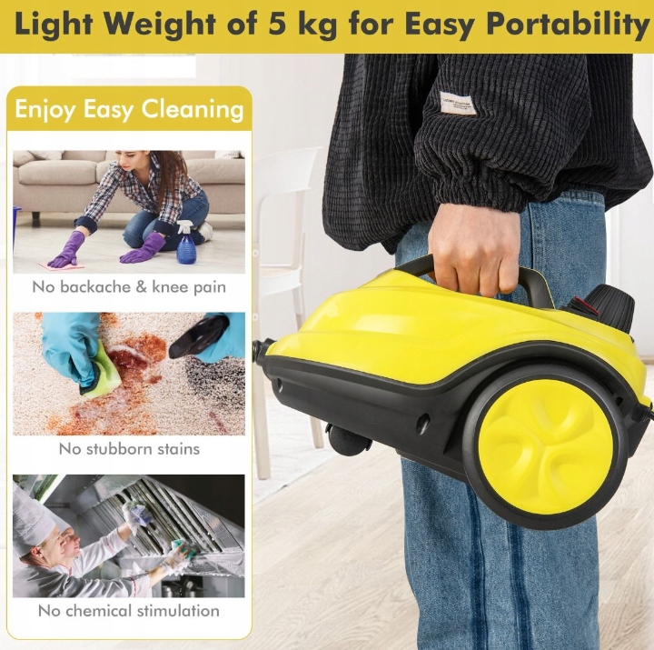 Ефективний набір для чищення парою з малою вагою 5 кг, який легко транспортувати Тепер ви можете насолоджуватися легким чищенням, без болю в спині та колінах, без стійких плям, без хімічного забруднення та неприємних запахів