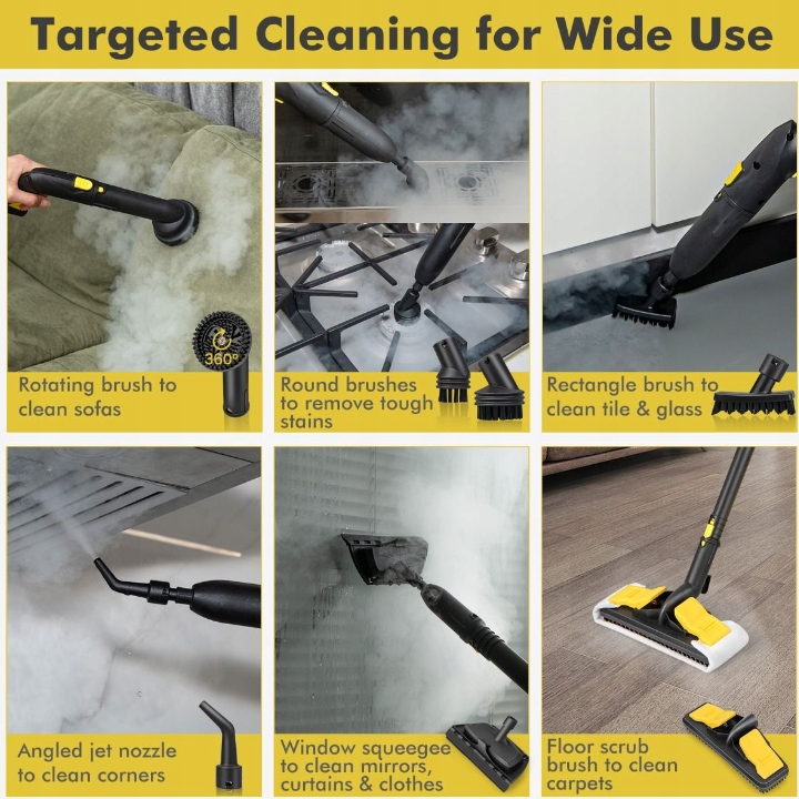 13 аксесуарів із широким спектром використання: Домашня пароварка оснащена 13 аксесуарами, включаючи щітку, що обертається на 360°, яка може повністю видалити стійкі плями та очистити кожну деталь. Загалом щоденне прибирання буде легким.