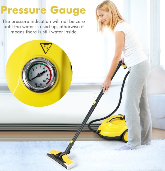Чудовий дизайн для безпеки: пароочисник має блокування спускового гачка на ручці, щоб запобігти випадковому запуску, а кришка бака може діяти як запобіжний клапан, щоб блокувати гарячу пару. Воду слід доливати лише тоді, коли манометр показує 0.