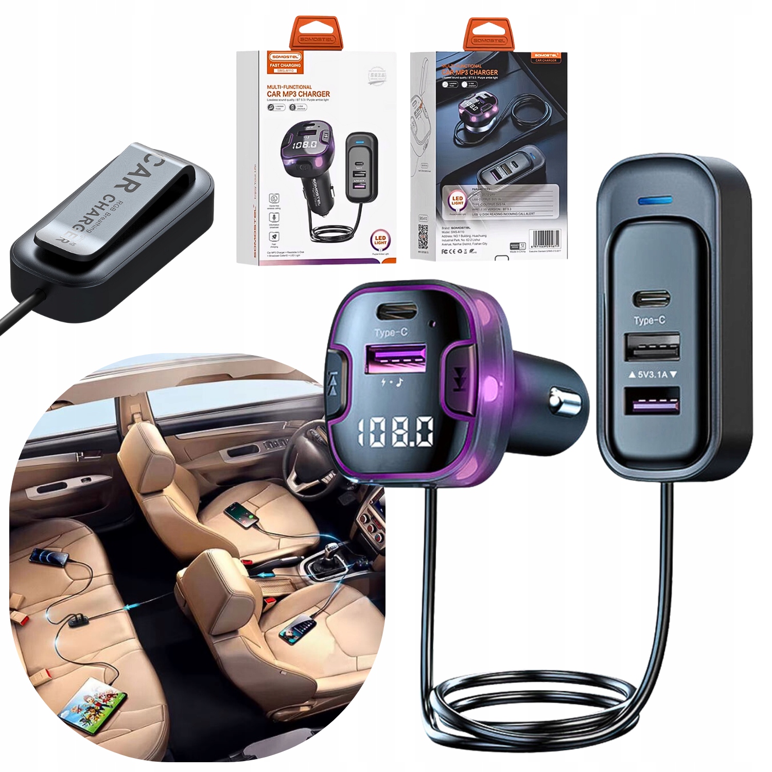 Сучасний багатофункціональний автомобільний зарядний пристрій SOMOSTEL SMS-A110 — це не тільки швидка зарядка до 5 пристроїв одночасно, але й FM-трансмітер, MP3-плеєр, функція handsfree та ефективний зарядний пристрій PD + QC3.0. Ідеально підходить для водіїв і пасажирів - як у передній, так і в задній частині автомобіля!