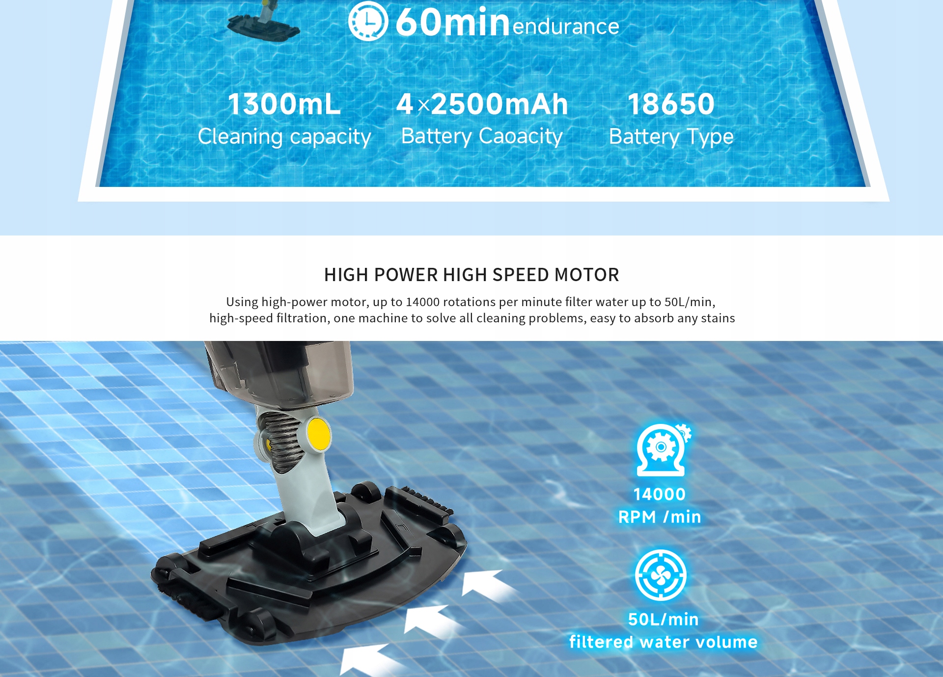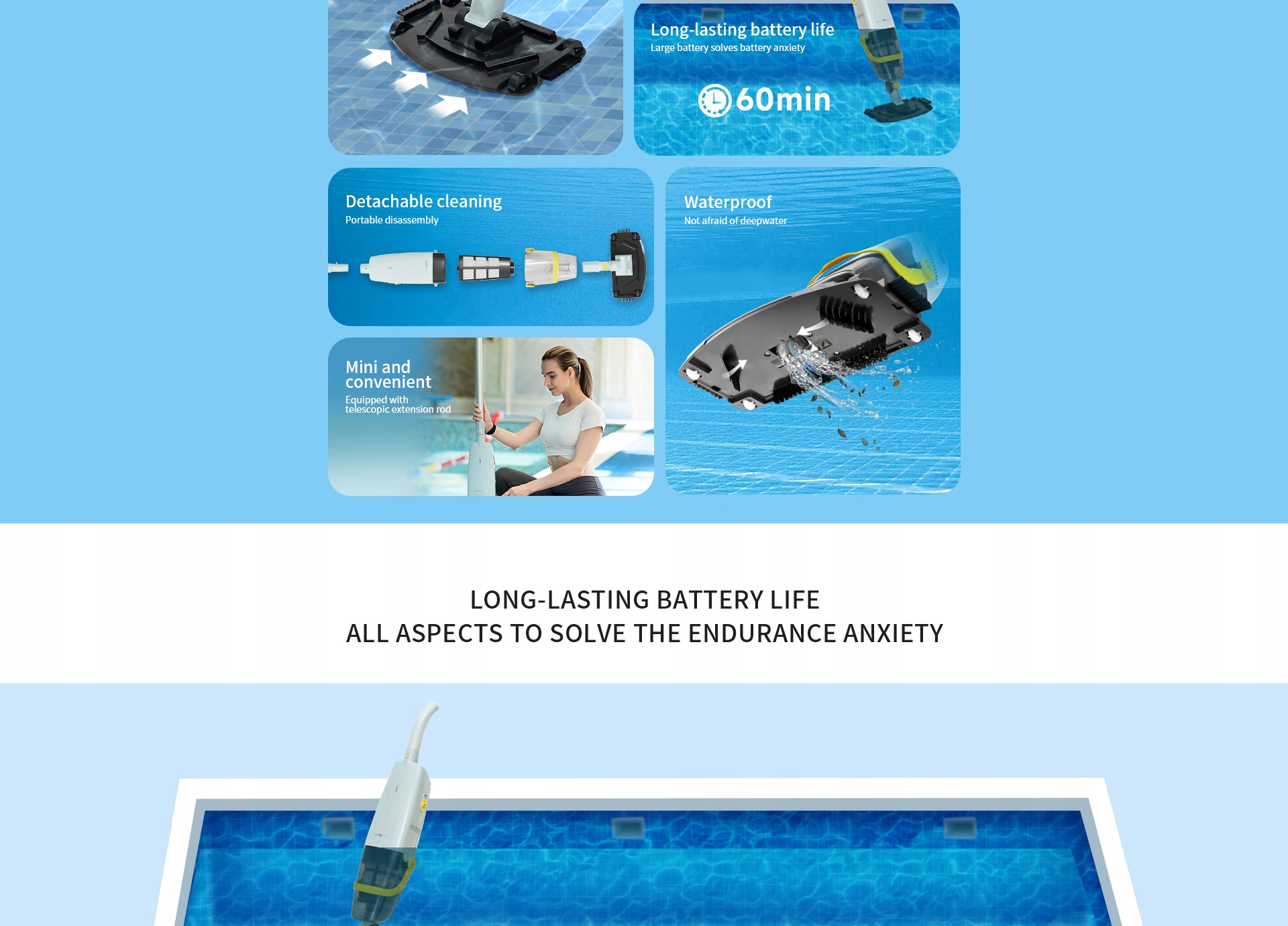 Здатність працювати протягом тривалого часу, зменшуючи поширені проблеми заряджання, покращуючи ефективність чищення та пристосовуючись до ваших потреб у комплексному очищенні басейну.