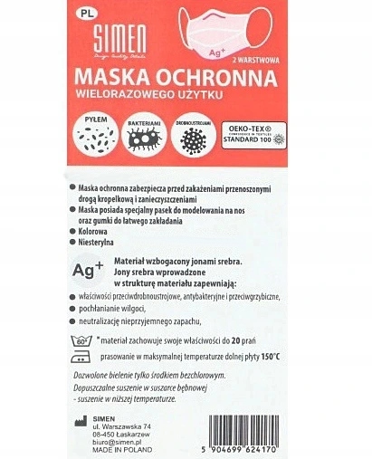 Захисна маска виготовлена зі 100% бавовни, призначена для всіх, незалежно від статі та віку. Маска захищає від крапельних інфекцій, мікроорганізмів і забруднюючих речовин. Маска має вушний тримач зі зручної еластичної гумки та спеціальної моделюючої смужки для носа. Бавовняний матеріал збагачений іонами срібла.