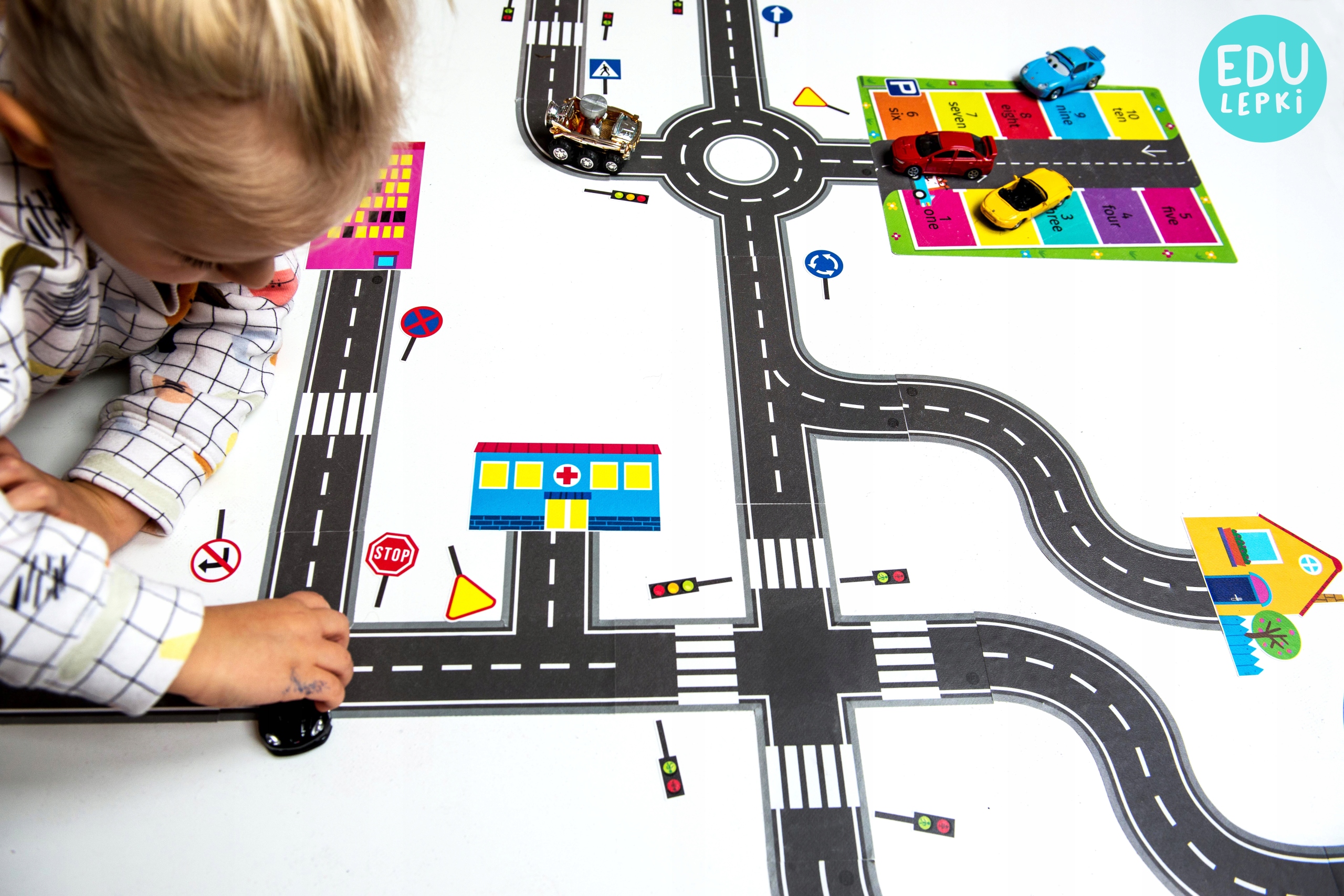 - Набір містить вулиці, дорожні знаки, світлофори, парковку для навчання рахуванню до 10 та різнокольорові будиночки, завдяки яким дитина зможе самостійно створити власне місто у своїй кімнаті на підлозі