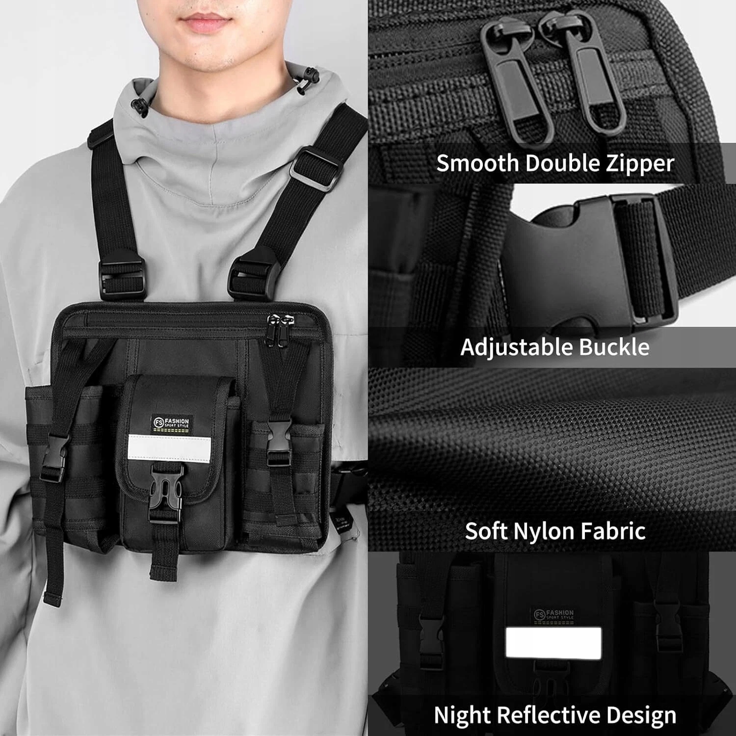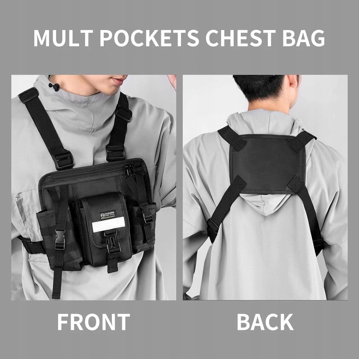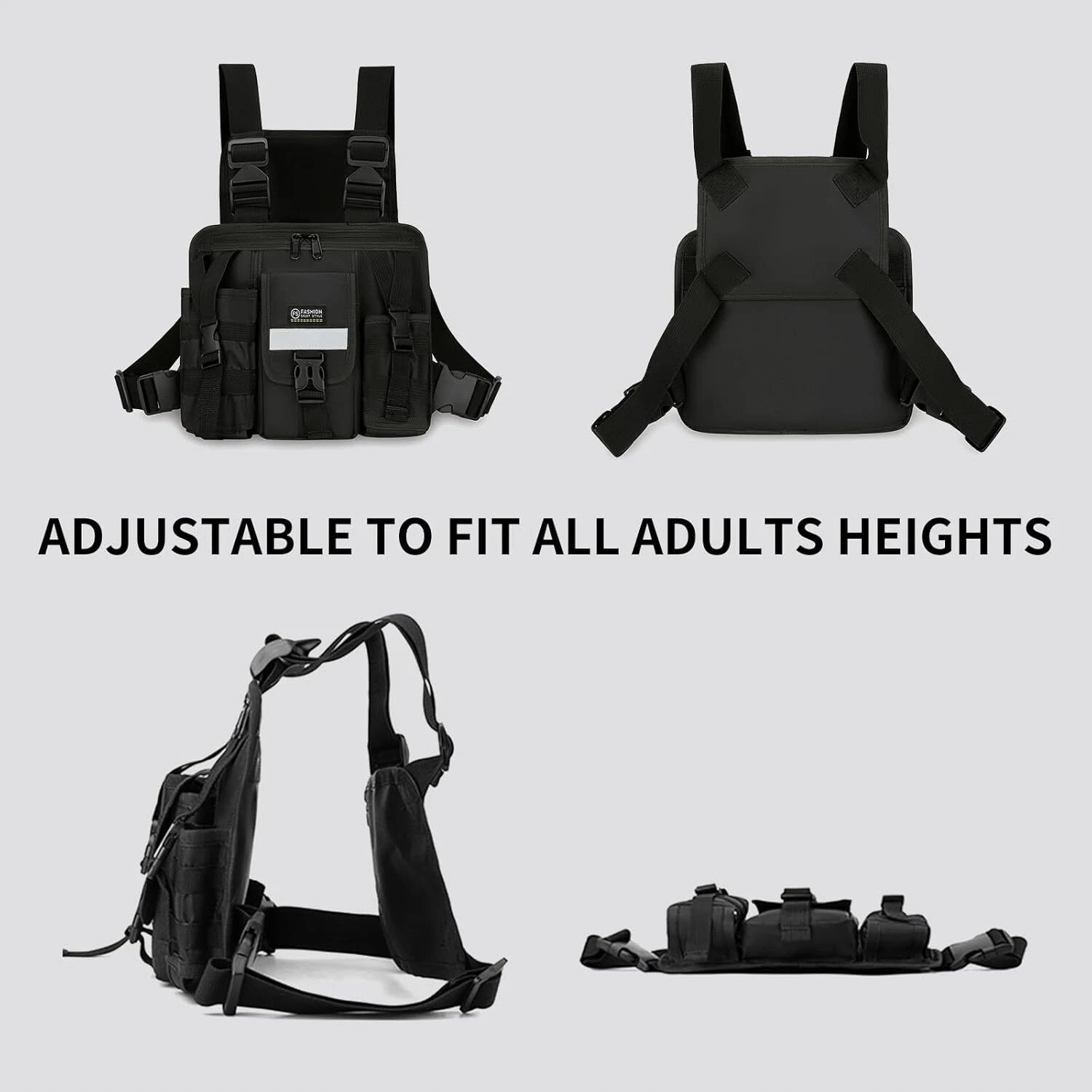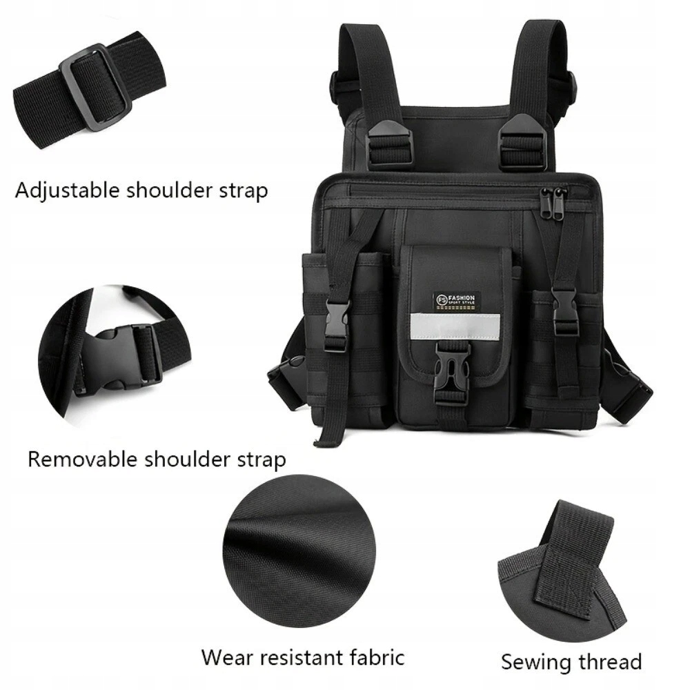 Багатоскетовий тактичний пакет для грудей з регульованими двома ремінцями, чорним кольором