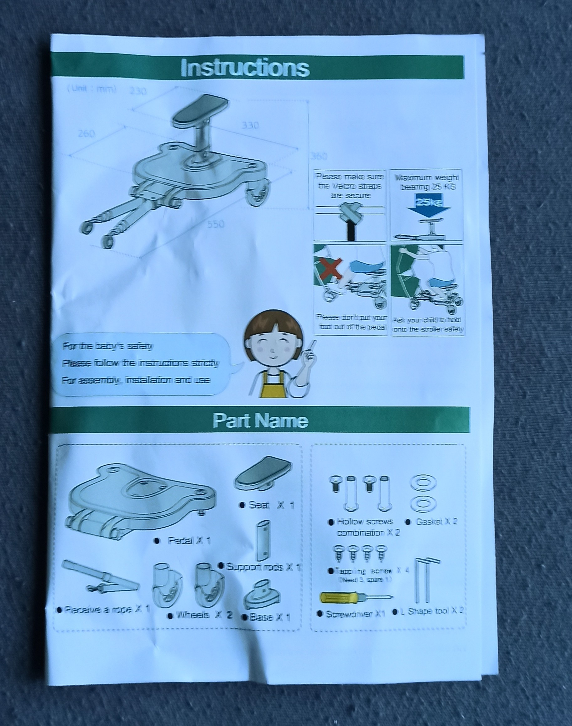 - Сценарій використання: якщо ви берете дітей в торгові центри, супермаркети, парки або в подорож, встановіть цю коляску, щоб їм було легше пересуватися. Не використовуйте його на нерівній або похилій поверхні.