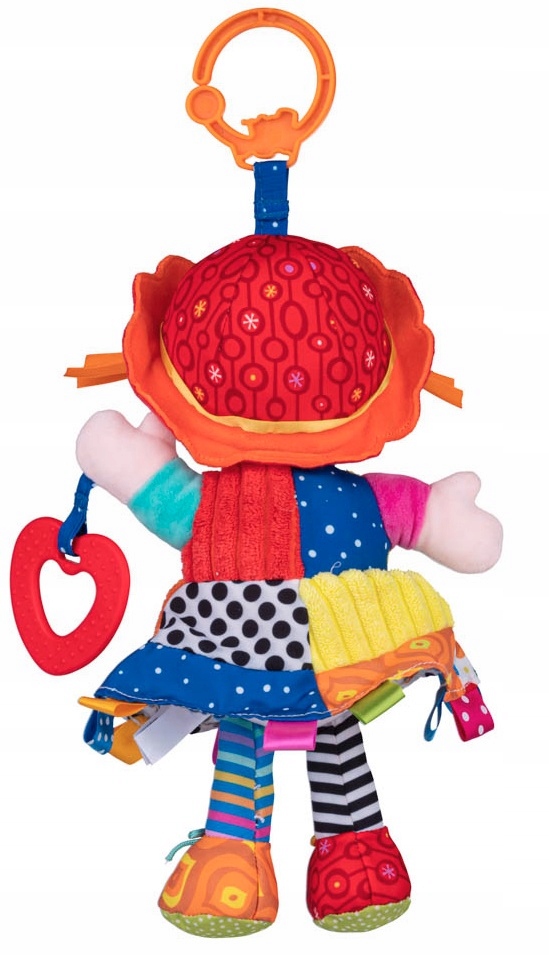 Лялька має прорізувач для зубів з виступами. на ручці, а в животику прихований дзвіночокякий видає веселий звук, коли ви трясете іграшку.