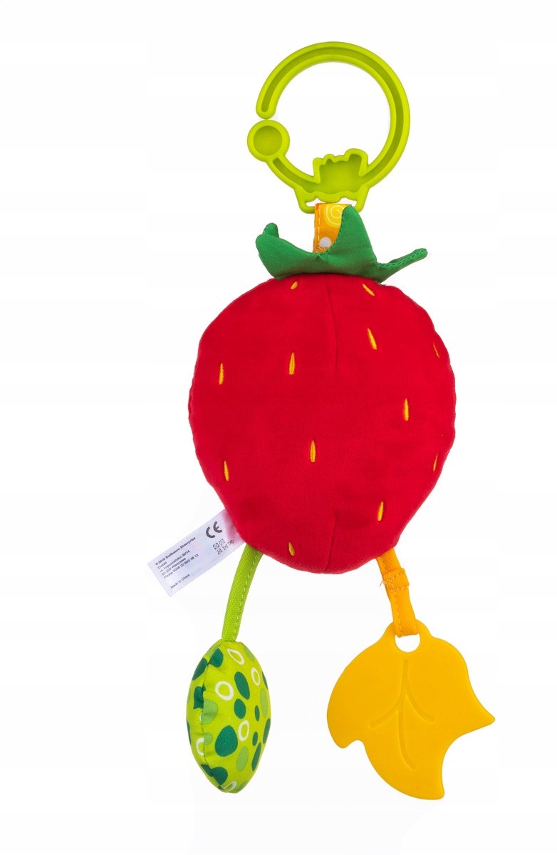 Фрукти та овочі приєдналися до родини плюшевих наречених! Червона полуниця щаслива дзвін при струшуванні. Має шуршачу ніжку, зелену пищалку і м'який прорізувач. Практична ручка дозволяє прикріпити кулон де завгодно.