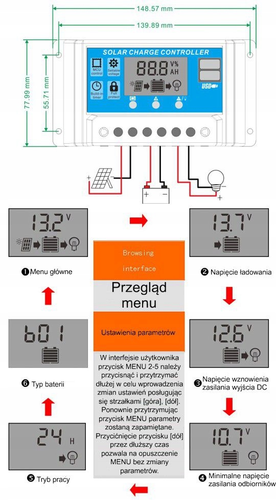 Максимальна напруга з'єднаних сонячних панелей не може перевищувати 50 В. Компенсація температури та періодична функція бажання акумулятора.