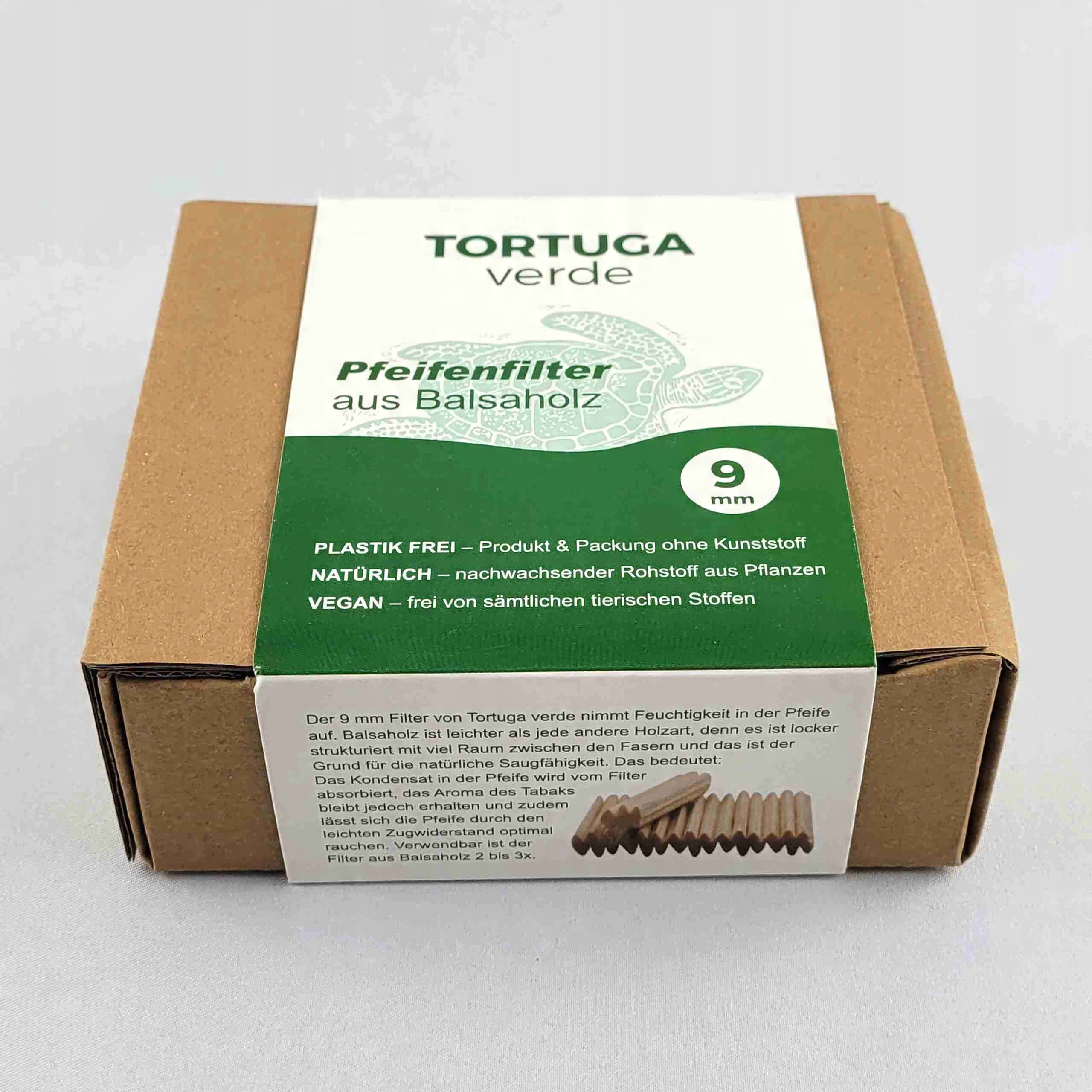 Tortuga verde — це трубчасті фільтри з натурального бальзового дерева. Вони забезпечують дуже високе поглинання вологи з диму і є цікавою альтернативою звичайним абсорбуючим фільтрам з вугільною вставкою. Призначені для труб з місцем для фільтра 9 мм, але їх можна легко адаптувати до менших розмірів. Виробництво H.H Німеччина, в упаковці 110 шт.